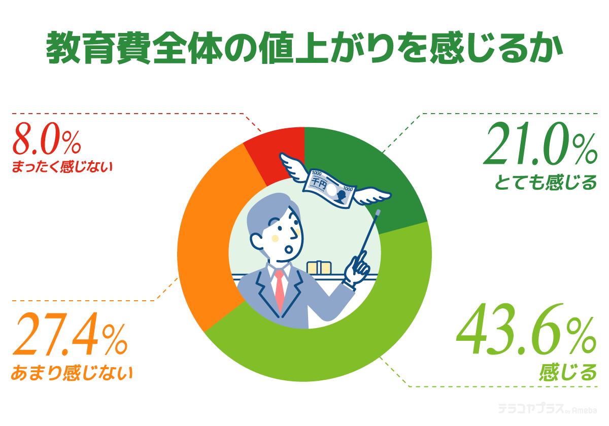 「テラコヤプラス by Ameba」では、小中学生の保護者500人に対して、近年の教育費に関する値上げについてどのように感じているか尋ねたところ、約6割が「教育費の値上がり」を実感していました。