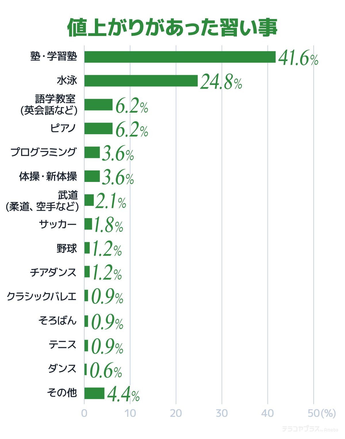 特にどの習い事で値上がりがあったか尋ねると「塾・学習塾」(41.6%)と「水泳」(24.8%)が突出して多い結果となりました。