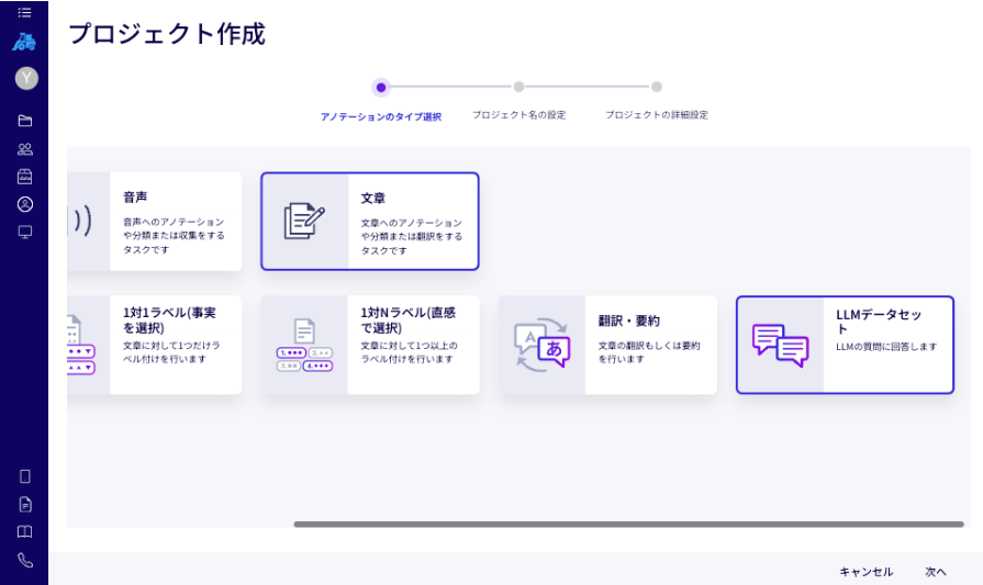 【プロジェクト作成時の新オプション】プロジェクト作成時に「文章」のアノテーションを選択することで、「LLMデータセット」のプロジェクトを新たに作成可能。