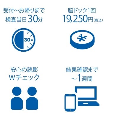 WEBでの予約と問診票の事前登録、受診結果をパソコンやスマートフォンで確認できるため、クリニック滞在時間を短縮し受付からお帰りまで30分。撮像されたデータは、放射線科診断専門医と脳神経外科専門医によるダブルチェックを行っています。万が一異常が確認された際も、結果に応じ専門の医療機関をご紹介します。