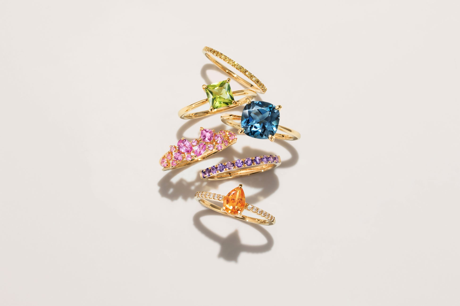最大の特長は、ジュエリーブランドとして国内最多級のラインアップを誇る、天然のカラーストーン(色石)の取り扱い種類です。日本を含む世界20カ国以上から買い付けるカラーストーンは、常時100種類以上を宝飾品にして販売しています。
