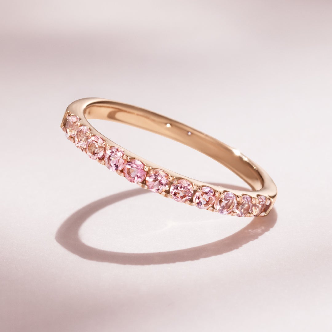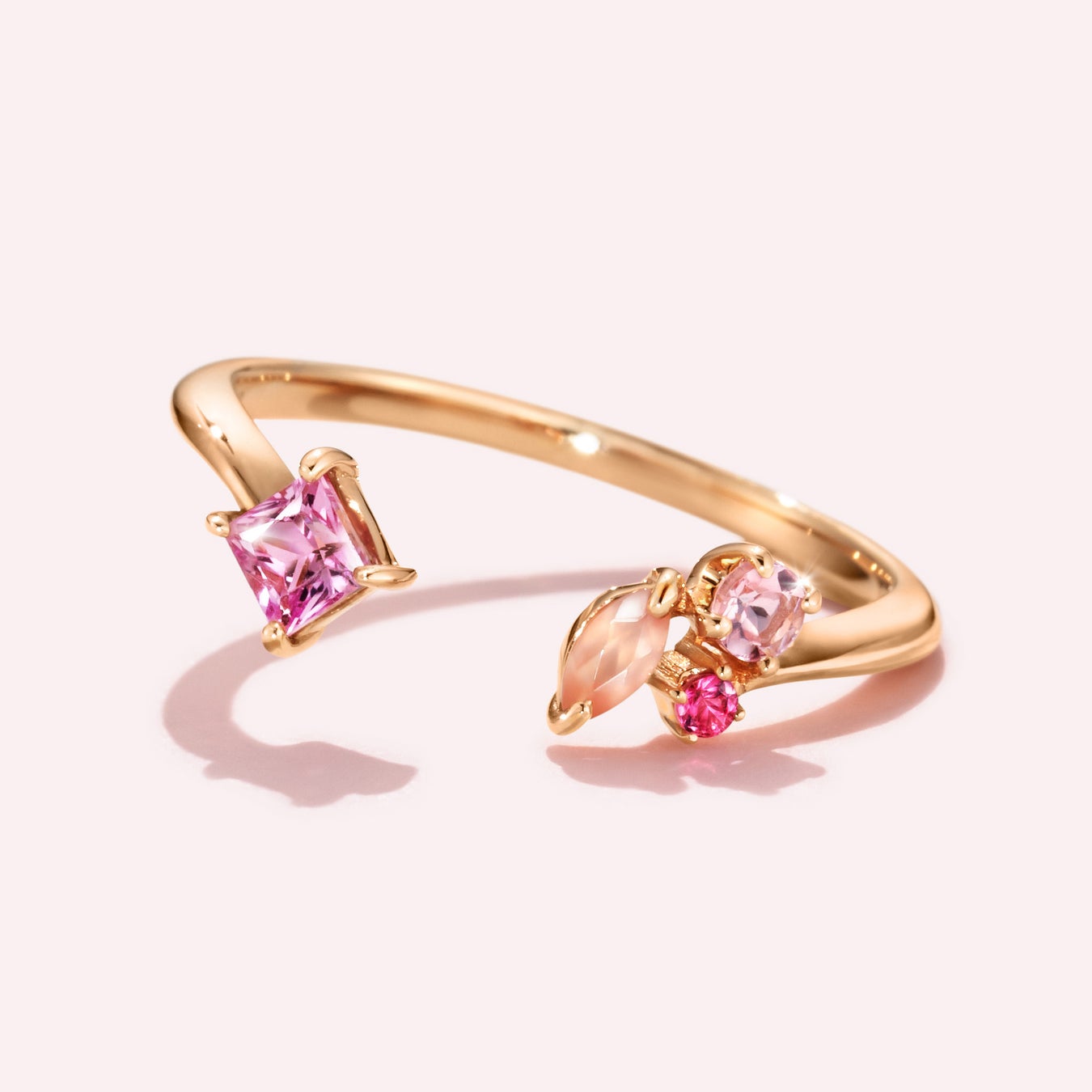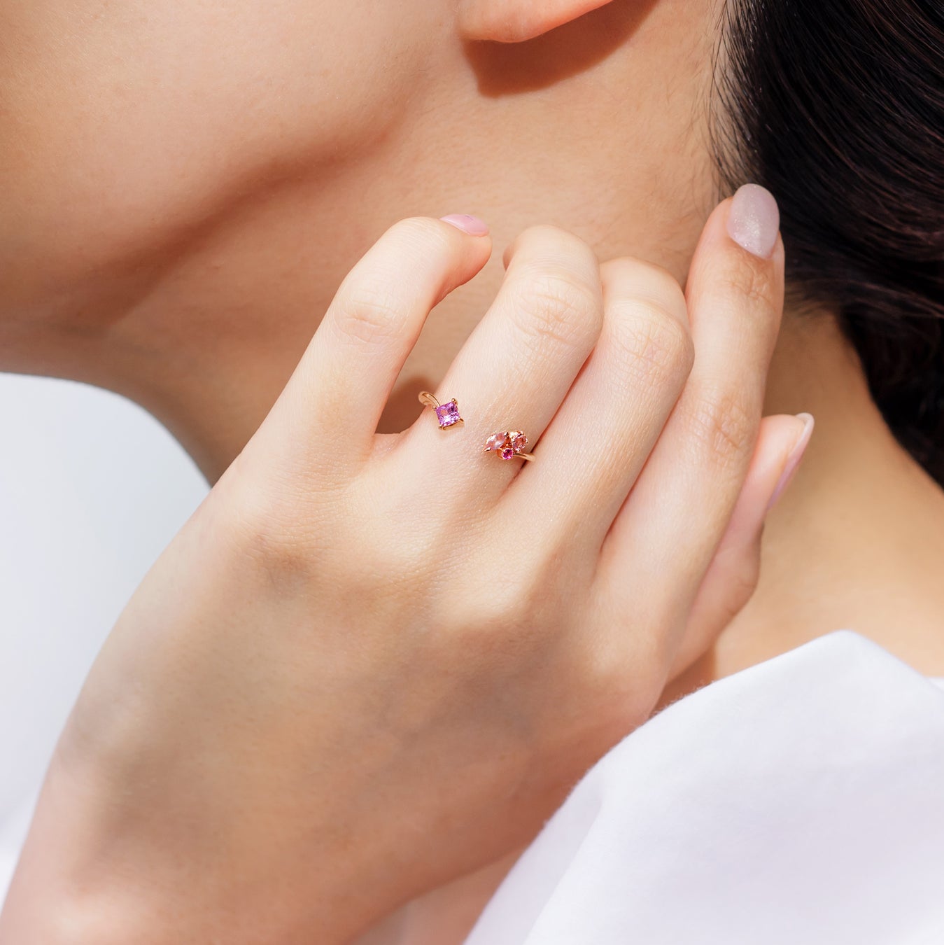 桜が見せる新しい季節への高揚感は、特別なもの。その高揚感をそのままに、リズムカルに宝石を配置したフォークリング。桜の情景から紡ぎ出された4種の宝石。満開の桜の情景を映すような華やかな輝きを見せる「ピンクサファイア」や、桜の花びらそのもののような柔らかな質感が魅力の希少石「ロードクロサイト」などを用いました。春の軽やかな空気感を演出するため、指を抱きしめるような形状のフォークリングに仕上げ、本能的に心が高鳴るアシンメトリーな配置に。自然が魅せる情緒的な美しさを表現します。