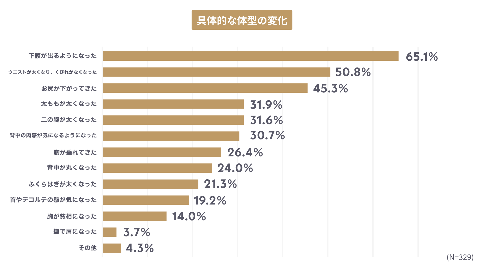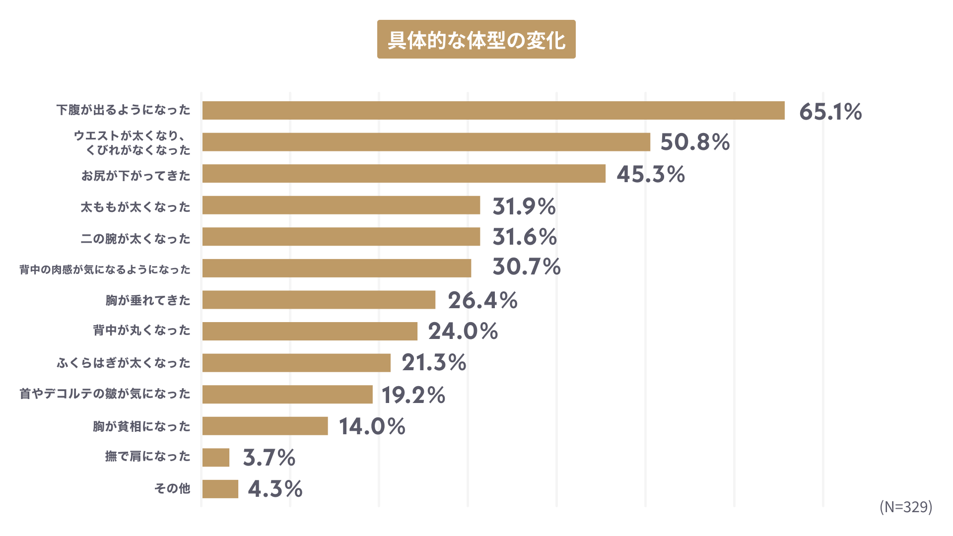 具体的な体型の変化としては、1位が「下腹が出るようになった」で65.1%、2位が「ウエストが太くなり、くびれがなくなった」で50.8%、3位が「お尻が下がってきた」で45.3%となりました。着にくくなったアイテムTOPは「スカート」、次いで「ワンピース」となり、お腹周りの悩みを強く感じている人が多いことが明らかになりました。