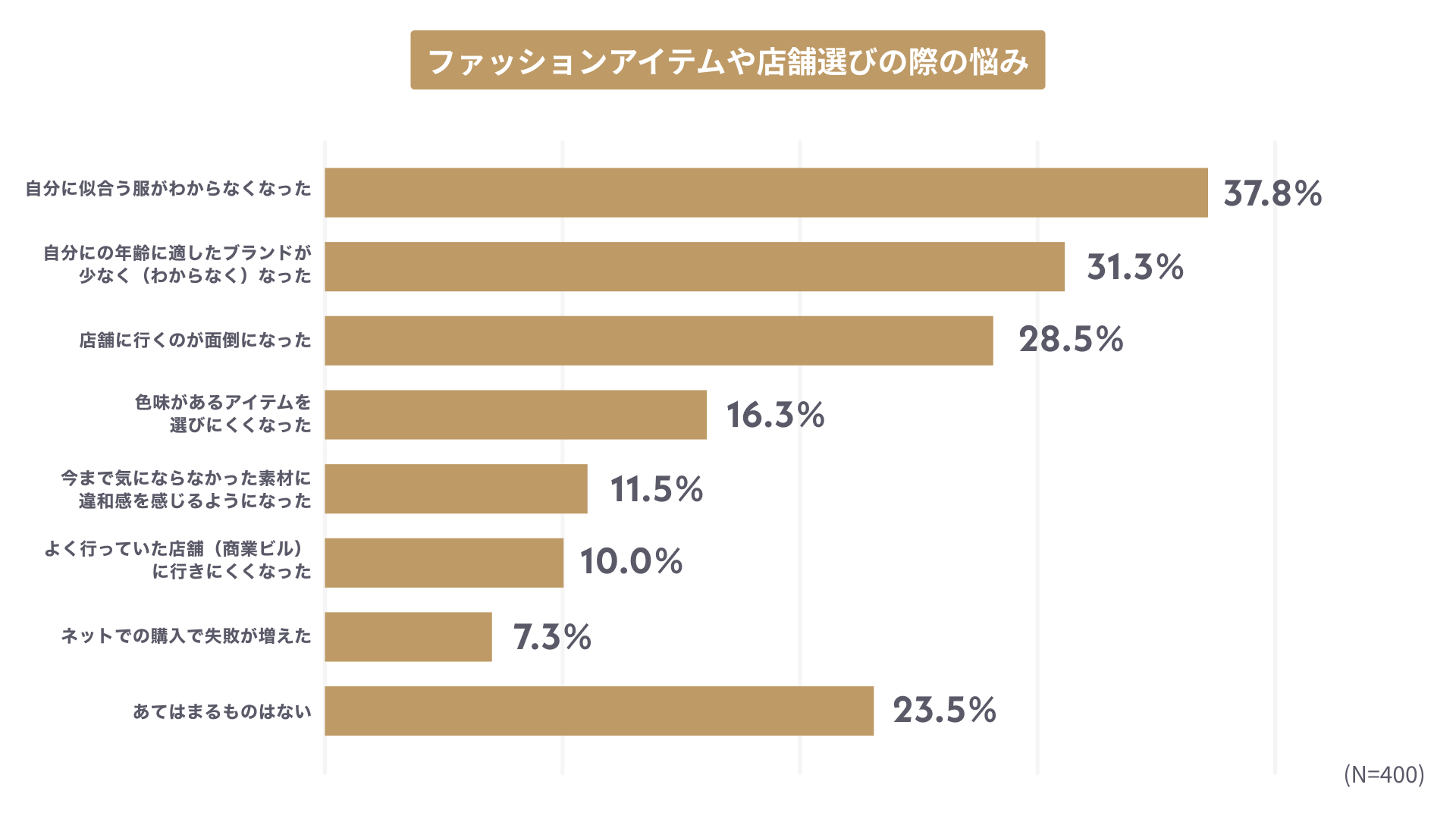 体型の変化により、多くの人がファッション楽しむことが難しいと感じていることが明らかになりましたが、体型変化に関わらず、歳を重ねたことでファッションアイテムや店舗選びに悩みが生じていることもわかりました。具体的な悩みTOPは「自分に似合う服がわからなくなった」で37.8%、次いで「自分の年齢に適したブランドが少なく(わからなく)なった」で31.3%という結果になりました。