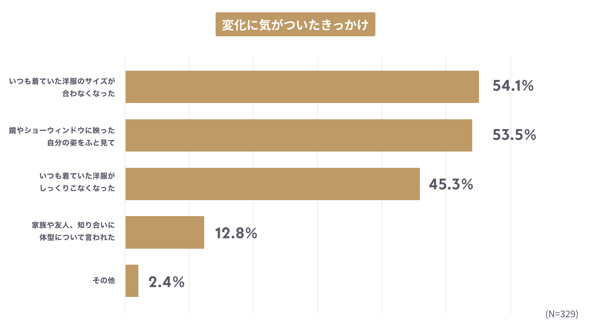 - 変化に気がついたきっかけ1位は「いつも着ていたサイズの服が着れなくなった」