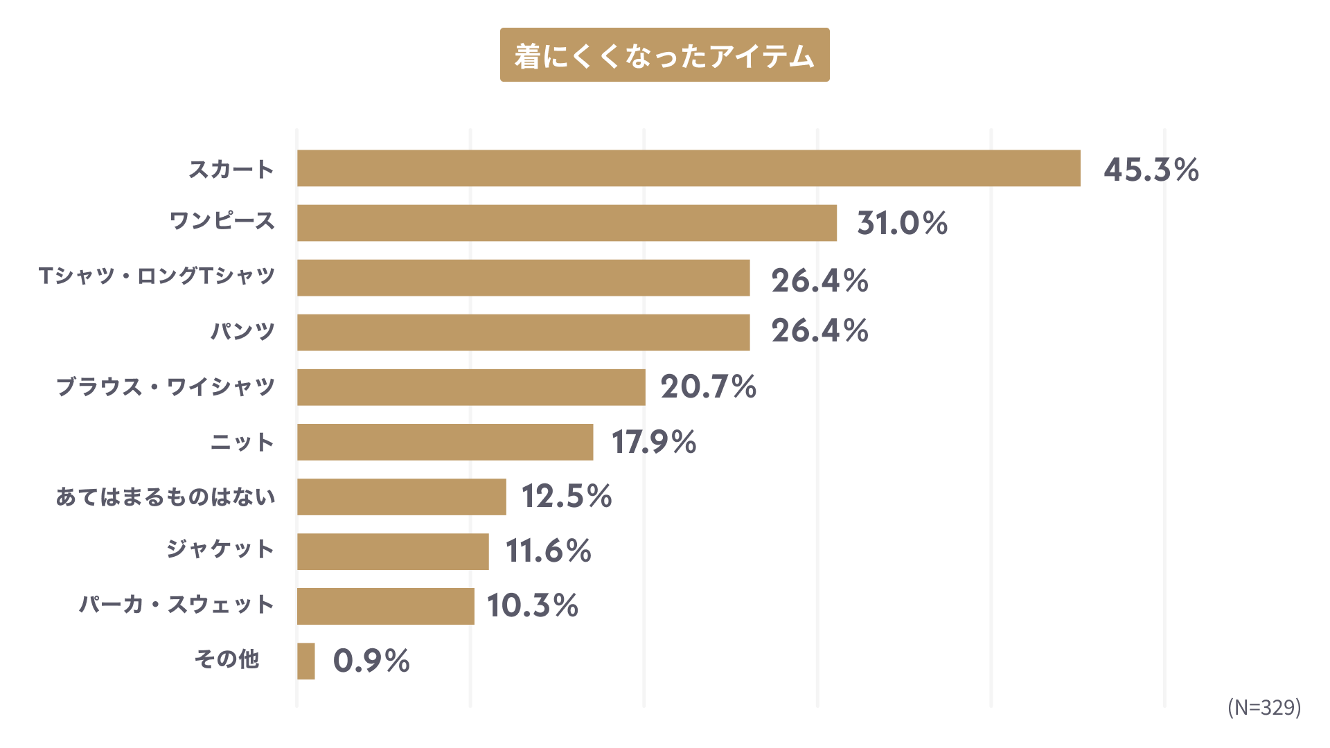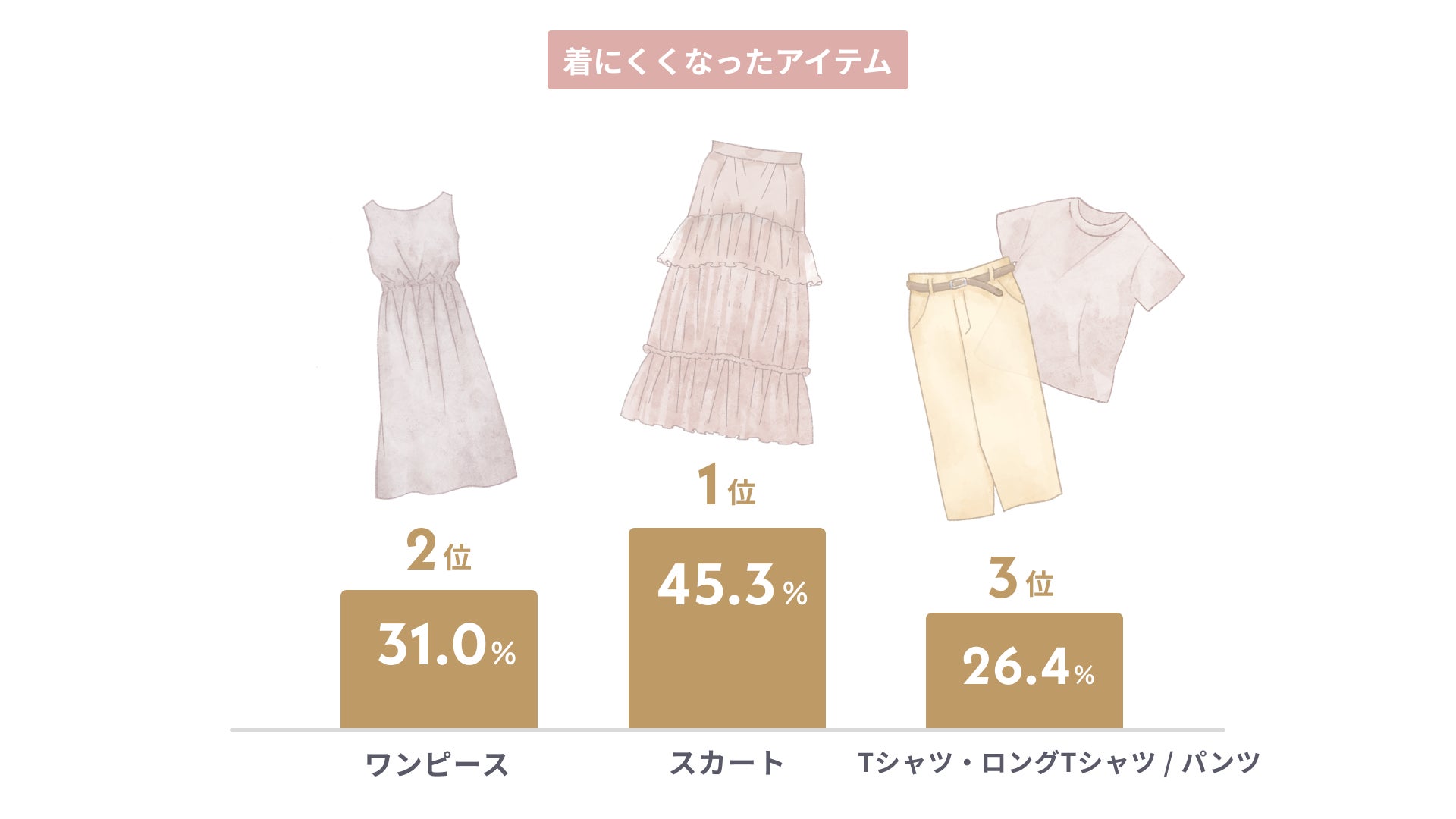 着にくくなったアイテムの1位は「スカート」でお腹周りの悩みが強い結果に