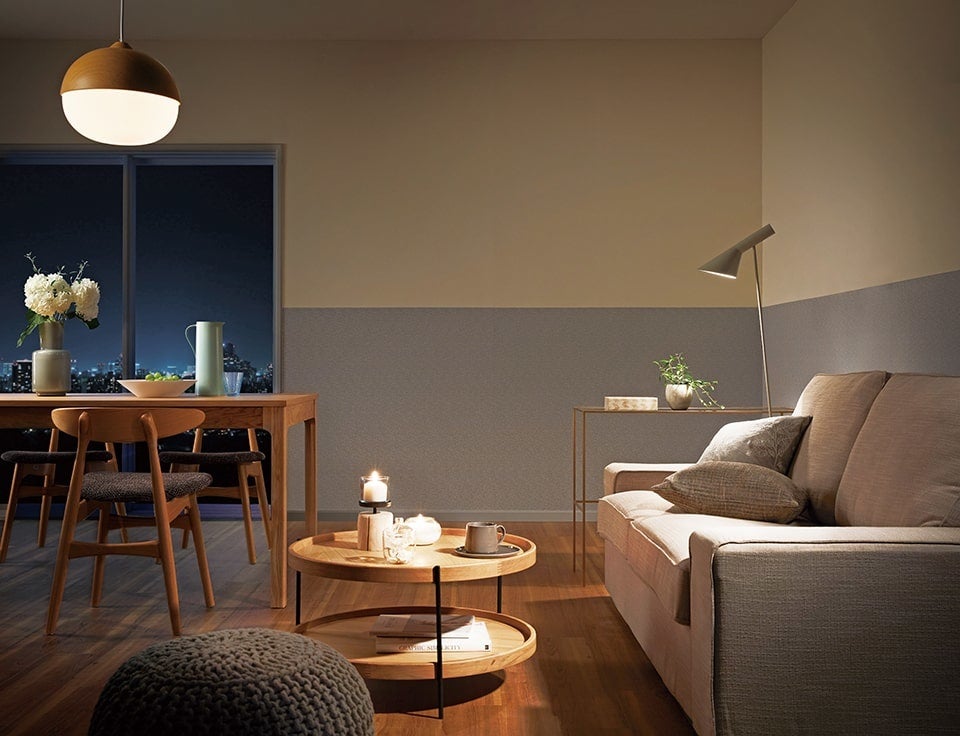 壁紙の貼り分けと照明の相乗効果を活かした施工例。壁紙は低い位置に濃い色を使い重心を下げ、照明は低い位置に配置することで、リラックス感を演出できます。