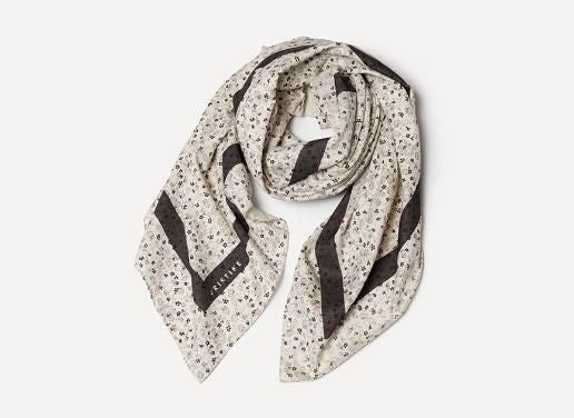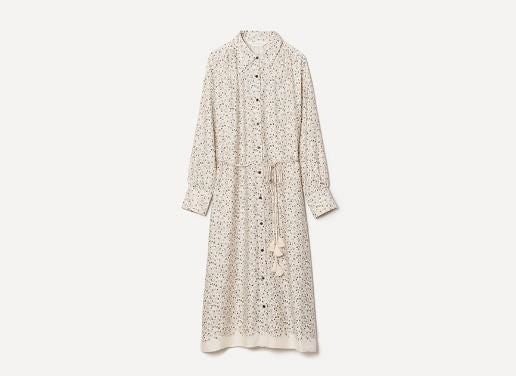 美しいドレープに載せたプリントは、秋風に吹かれて踊るような魅力的な雰囲気に。やわらかなサテンの落ち感がリッチでラグジュアリーな着こなしを演出します。
