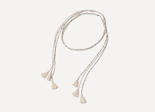 ウエストに巻いたり、首元に巻いたり、アクセサリーのようにお使いいただけるアイテムです。3本の内1本は無地のサテン生地を使用し、抜け感を出しました。