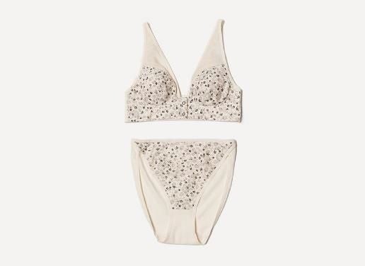 山帰来のプリント生地で作ったブラ&ショーツです。山帰来の繊細なプリントが女性らしい雰囲気で、思わず可愛いと手に取りたくなるアイテムです。