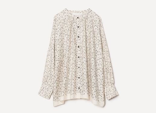 衿ぐりや袖口に入れたギャザーが、滑らかなサテンのプリント生地にもマッチし、ふんわりとしたシルエットデザインが魅力です。
