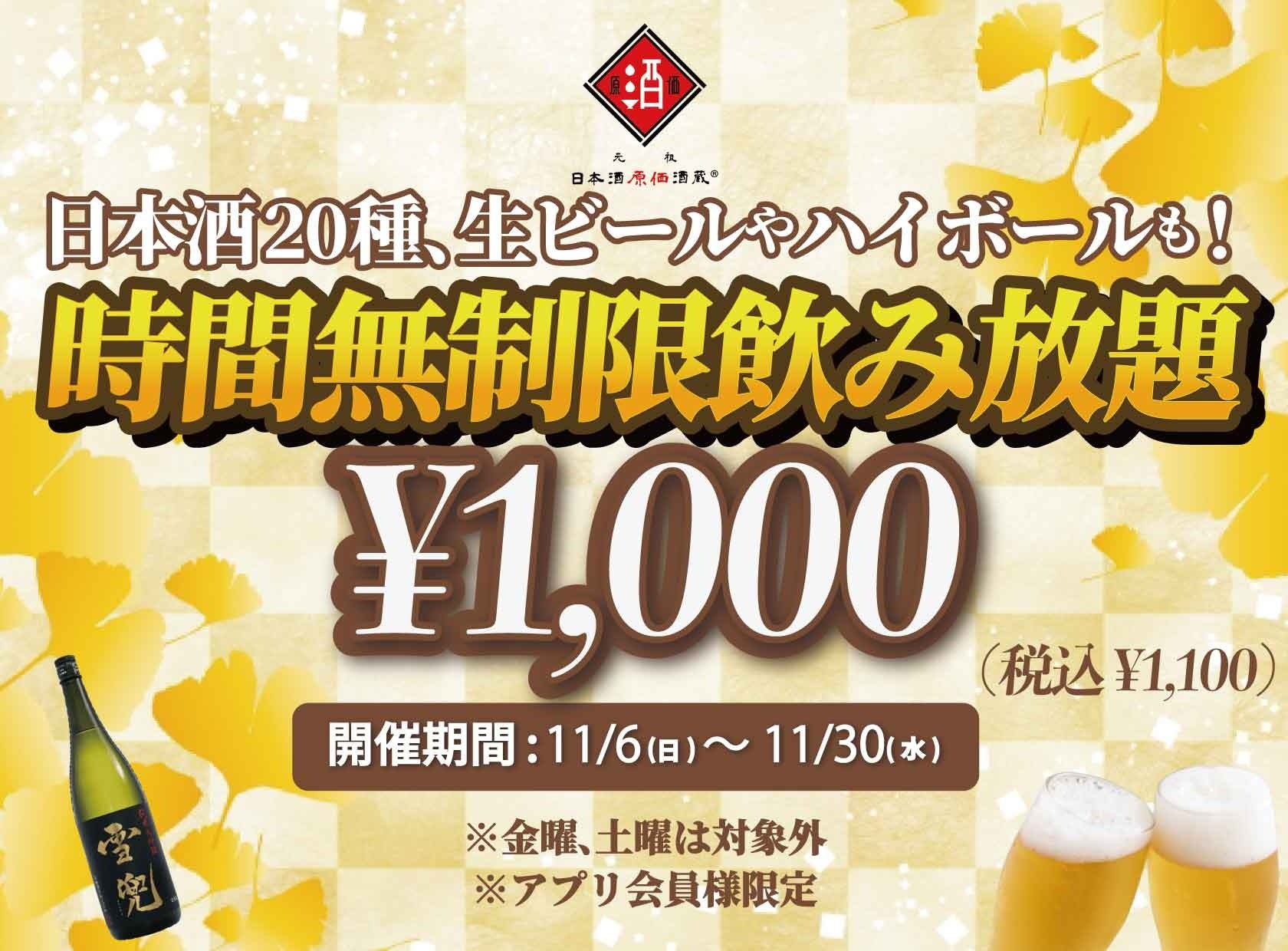 11月6日(日)~11月30日(水)に日本酒原価酒蔵全店にて時間無制限飲み放題¥1,000(税込¥1,100)を開催します。