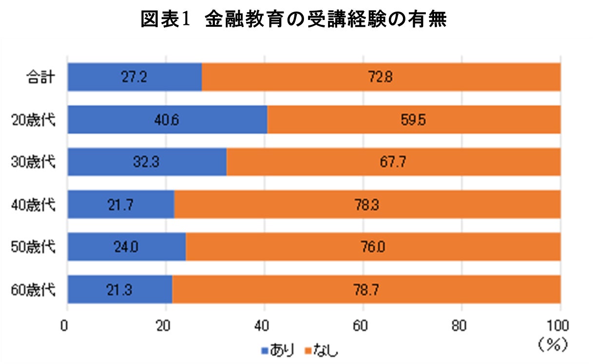 アンケート調査の結果によると、学校や職場で金融教育の受講経験が「ある」人は4人に1人強(27.2%)。年齢別では、若年層の方が受講経験者比率が高く、20歳代(40.6%)と60歳代(21.3%)では約2倍の差がついている(図表1)。