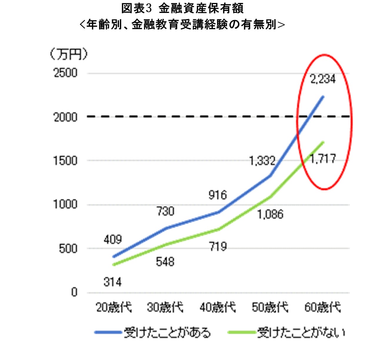 そして、受講経験の有無により、60歳代の金融資産保有額には500万円以上の差が生じることがわかった。