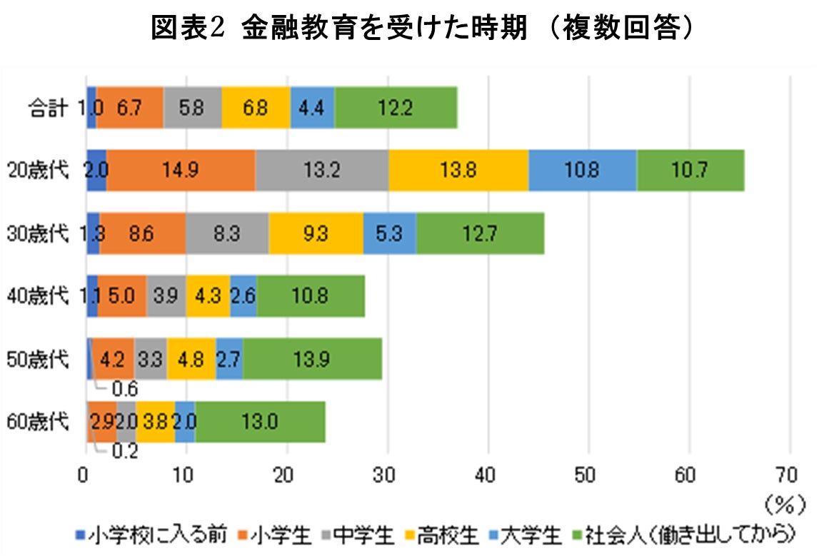 金融教育を受けた時期については、回答者全体では「社会人になってから」の人が12.2%と最も多い(図表2)。企業型DC制度導入企業に対し、「従業員に対する継続的な投資教育の実施」が努力義務として課せられていることが関係していると考えられる。