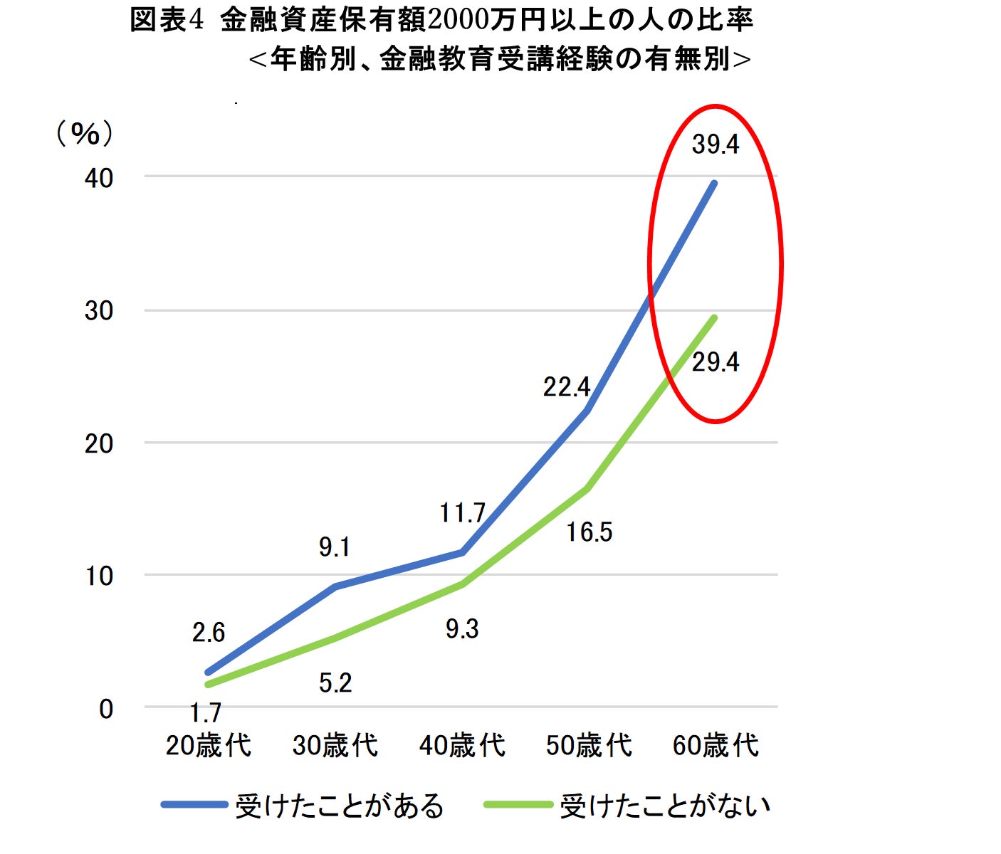 また、60歳代で保有額が「2,000万円以上」の人の比率も、受講経験が「ある」人では4割(39.4%)、「ない」人ではでは3割(29.4%)、となっていた。