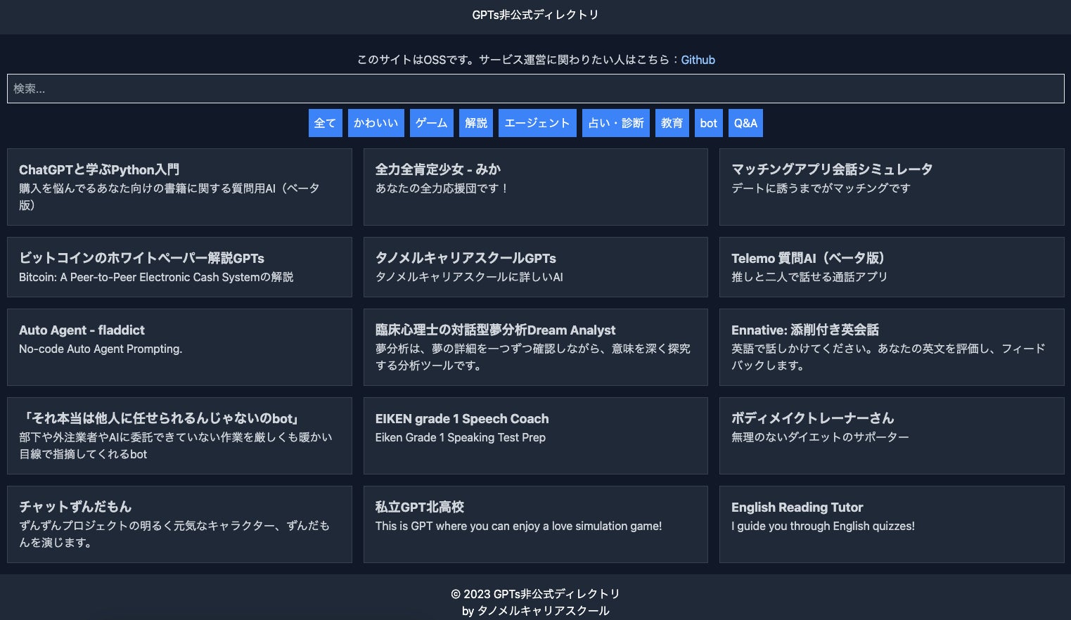 自作GPTsを登録「日本版GPTs非公式ディレクトリ」OSSで公開、ソースは80%ChatGPTで作成