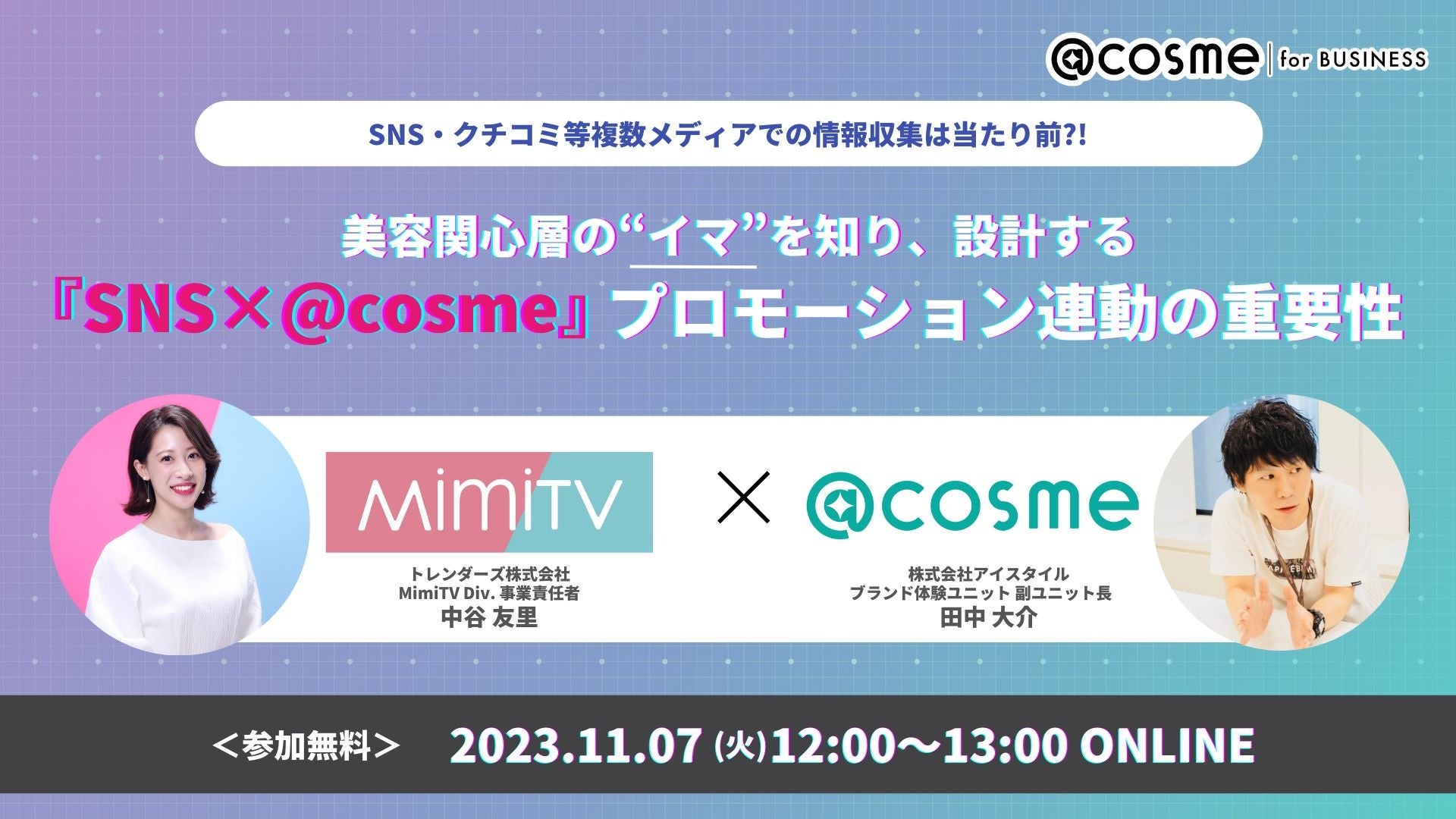 【11月7日(火)開催】MimiTVと@cosmeの事業責任者が共に語る! 「美容関心層の“イマ”を知り、設計する 『SNS×@cosme』プロモーション連動の重要性」