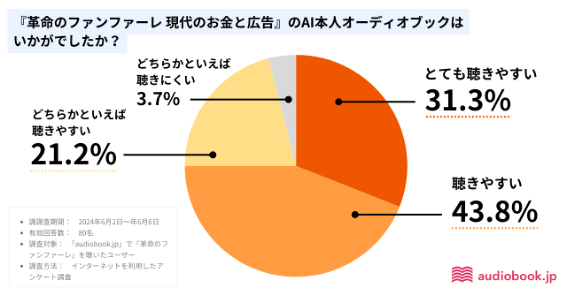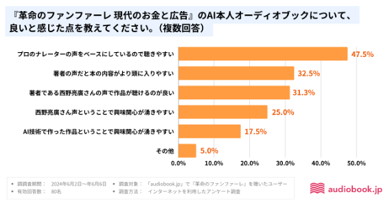 『革命のファンファーレ 現代のお金と広告』のAI本人オーディオブックについて、視聴したユーザーの96.3%が「聴きやすい」と回答(「とても聴きやすい」31.3%、「聴きやすい」43.8%、「どちらかといえば聴きやすい」21.2%)。同作品の良いと感じた点についての問いでも、「プロのナレーターの声をベースにしているので聴きやすい」(47.5%)との回答が最も多く、品質的が高く聴きやすい点が高評価されていることがわかりました。