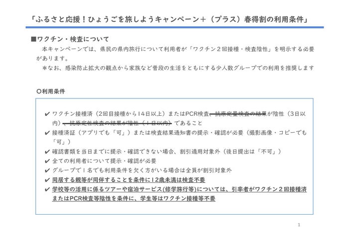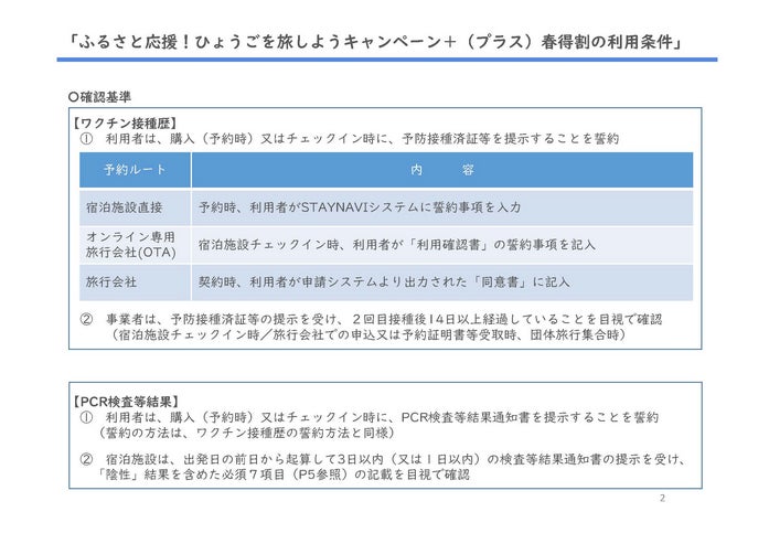 接種済証またはPCR検査等結果通知書(撮影画像、コピー、電子的な証明書でも可)の確認は、同行者も含めて旅行者全員について実施しますので、チェックイン時(旅行会社の場合は予約証明書等お渡しの来店時)にご提示ください。提示のない場合は割引支援を受けることができません。