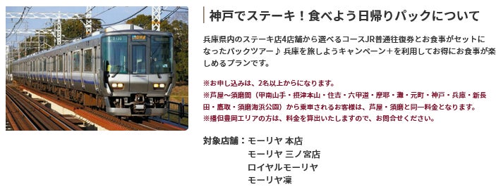 株式会社フォーティーズ(本社:大阪市鶴見区、代表取締役 岡武史)は4月28日迄延長になった「ふるさと応援!ひょうごを旅しようキャンペーン」の対象商品としてステーキハウスモーリヤグループのステーキと往復JRがセットになったパックツアーのオンライン販売を開始いたしました。