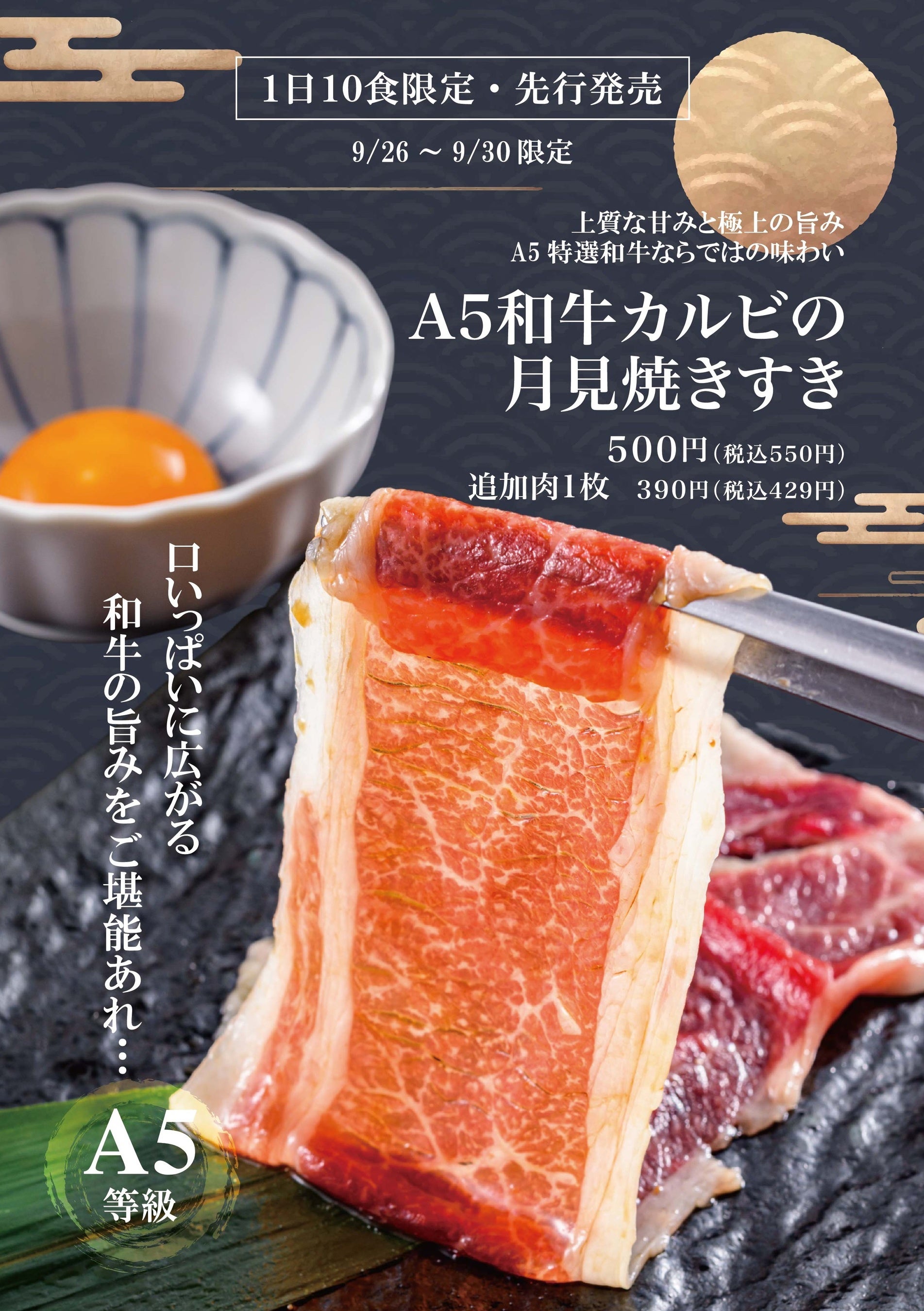 ●内容:各店舗1日10食限定で『A5和牛カルビの月見焼きすき』税込550円を先行販売