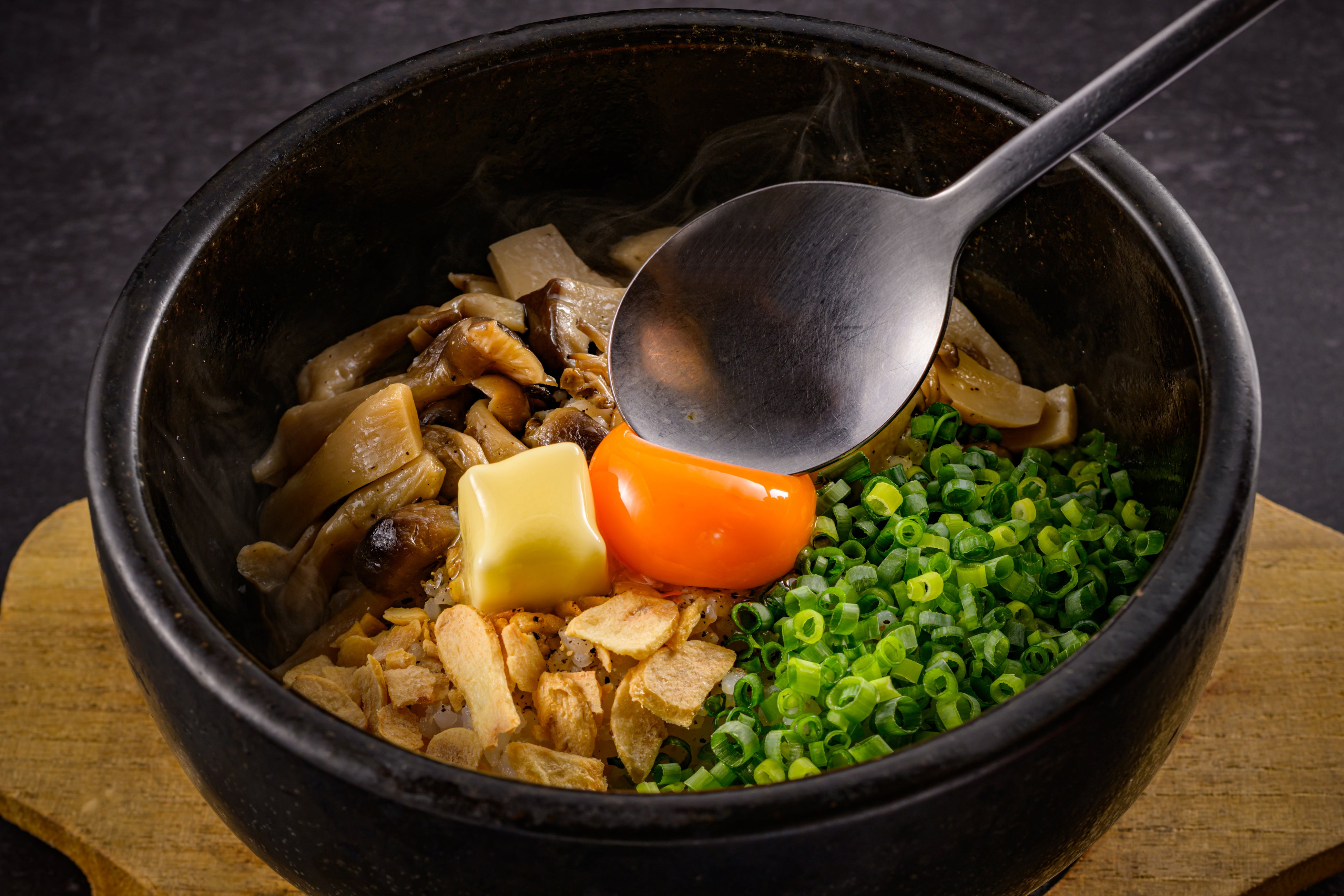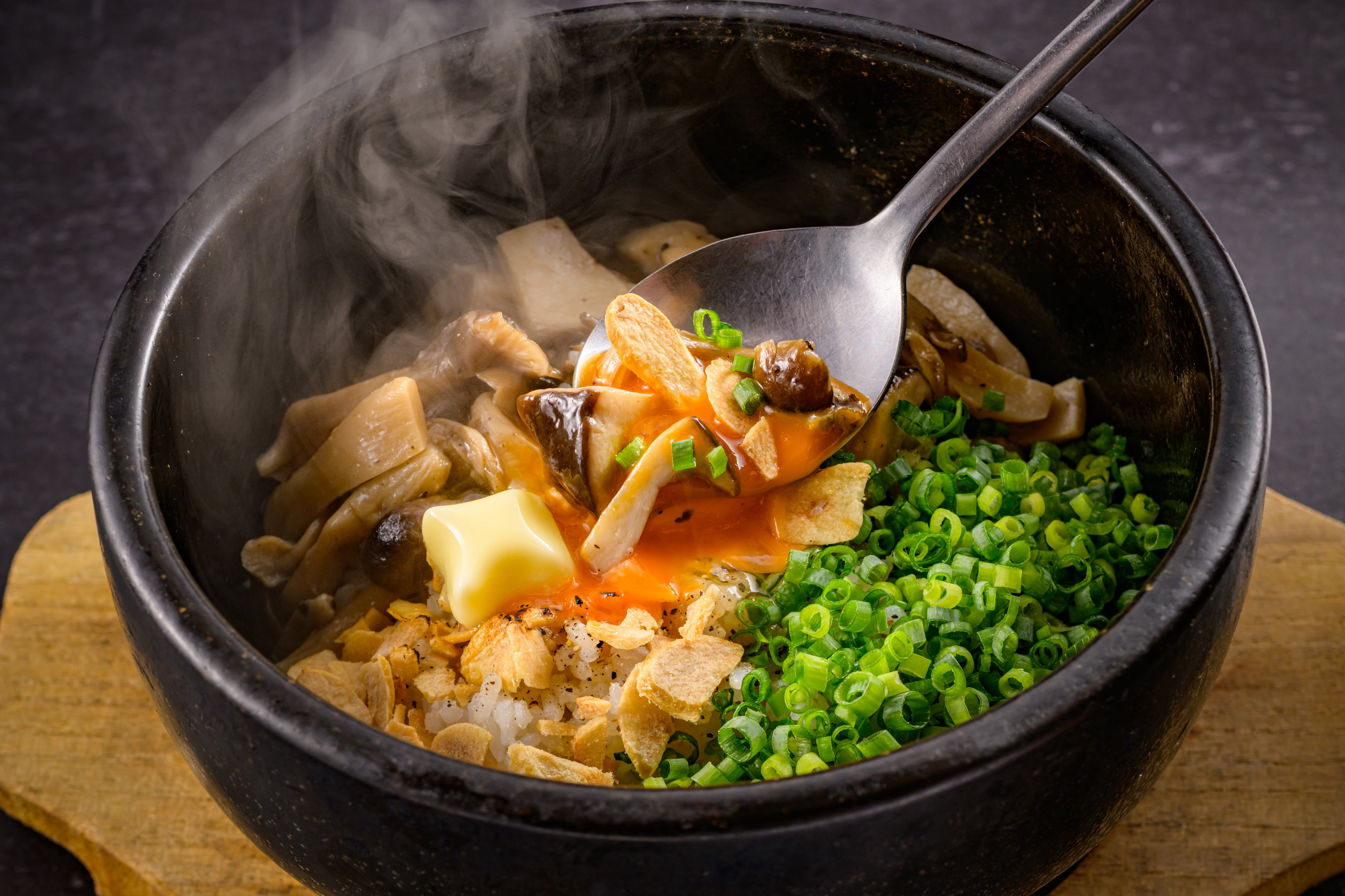 『秋限定コース』でご好評いただいている『旬のきのこナムル』『アボカドキムチ』『ほうじ茶アイスの練乳もなか』『ほうじ茶アイス』の4品に加え、『きのこのガーリックライス』に卵黄、バターを追加した、アツアツの石焼でご提供する『“ガリバタ醤油香る”石焼月見きのこライス』などの秋が旬の食材をふんだんに使った逸品たち。