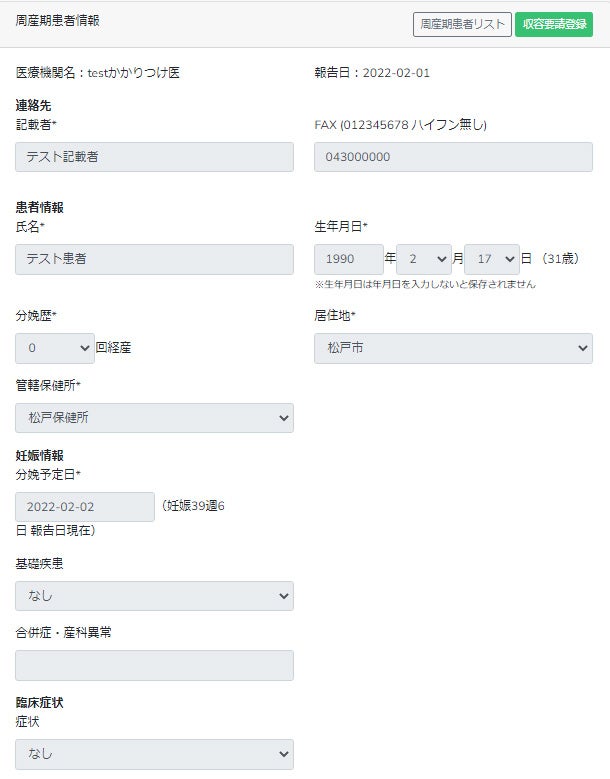 妊婦の入院が必要となり、かかりつけ産科医から入院依頼を受けた周産期母子医療センター等が自院で受け入れ困難な場合は、かかりつけ産科医からの妊婦情報に加えて、詳細なCOVID-19臨床症状の情報を入力し、他の周産期母子医療センター等に一斉に収容依頼(「収容要請登録」をクリック)を行います。