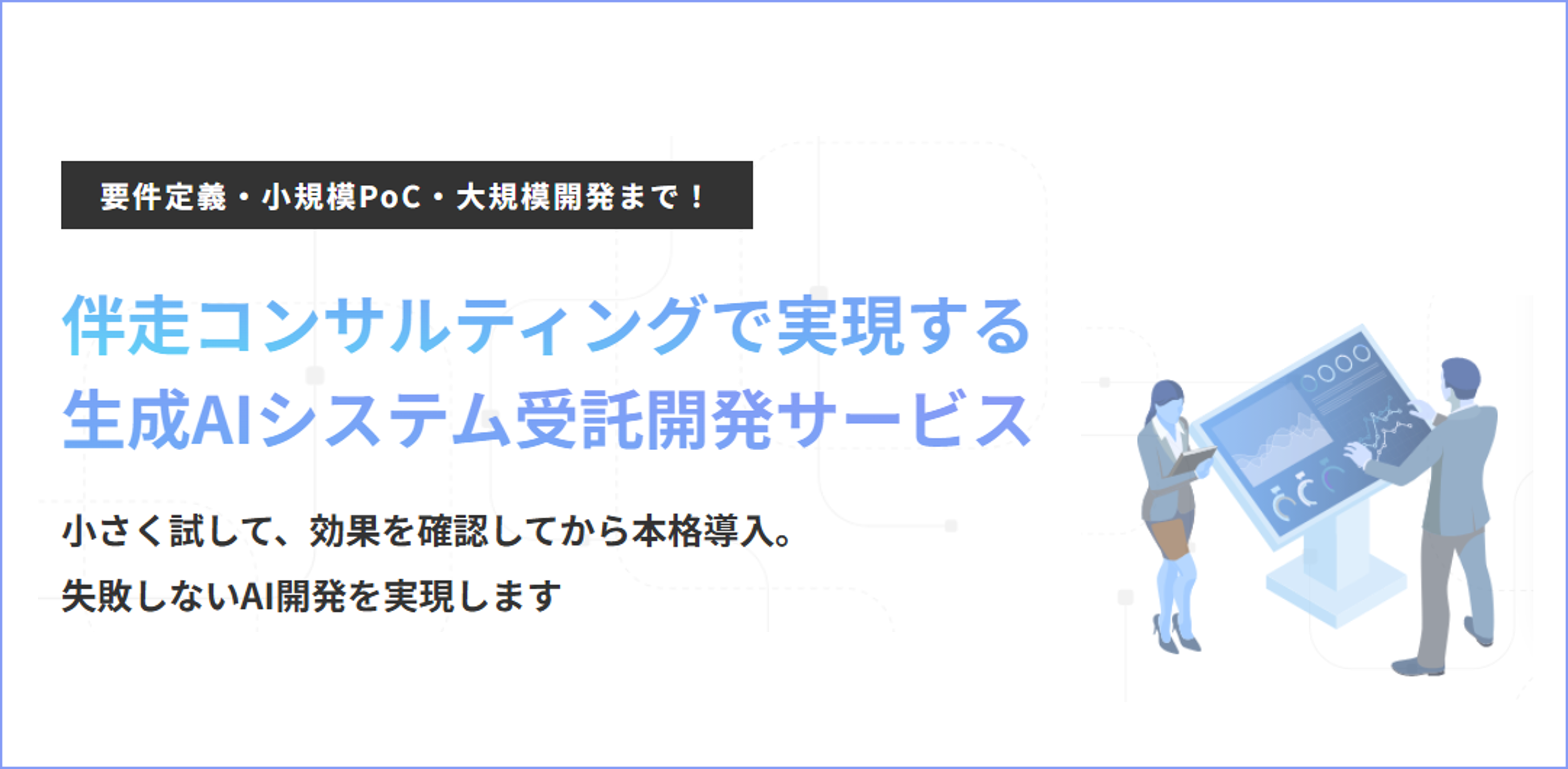当社の生成AI導入・活用サービスは、要件定義から小規模PoC、大規模開発まで一貫サポートする受託開発サービスです。「小さく試して効果を確認してから本格導入」という段階的アプローチで失敗リスクを最小化。曖昧な課題を具体的な開発要件へ翻訳するコンサル力と、複数のAIモデルを使いこなす技術力が強みです。初期コストを抑えながら、確実な成果を目指す企業に最適なソリューションを提供します。