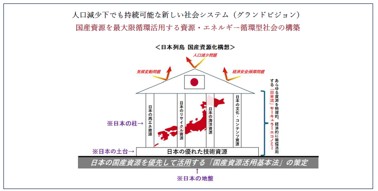 あらゆる国産資源を積極活用することで、資源の海外依存による国富の流出を防ぎ、人口減少下でも実質賃金の向上に寄与するとともに、資源の供給途絶という経済安全保障上のリスクに対応し、さらには気候変動問題へも対処する新しい社会システム(グランドビジョン)を構築する。