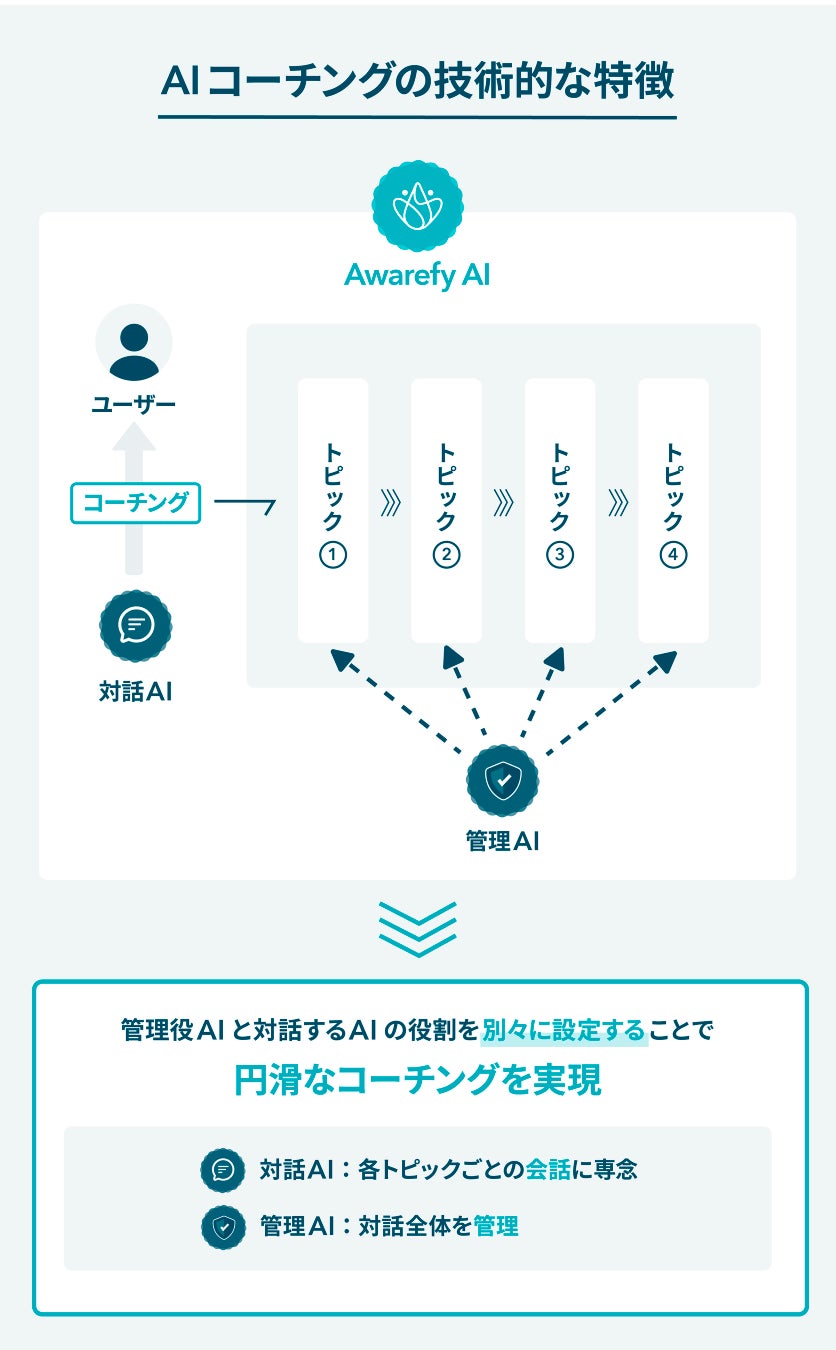 一方的な質問だけにならないよう、Awarefy AIでは役割として、コーチングの対話をするAIだけでなくコーチングのプロセスを管理するAIを別で設けることで円滑なコーチングが行えるようになっています。