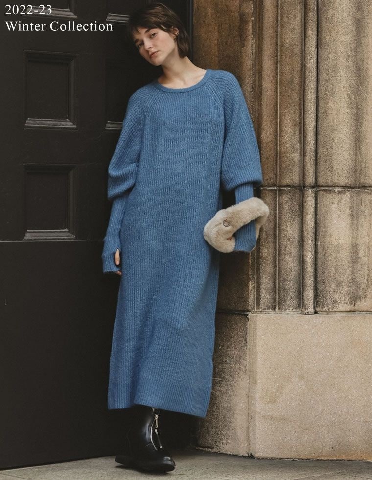 [低身長サイズ有]指穴ボリュームスリーブ畦編みリブニットワンピース