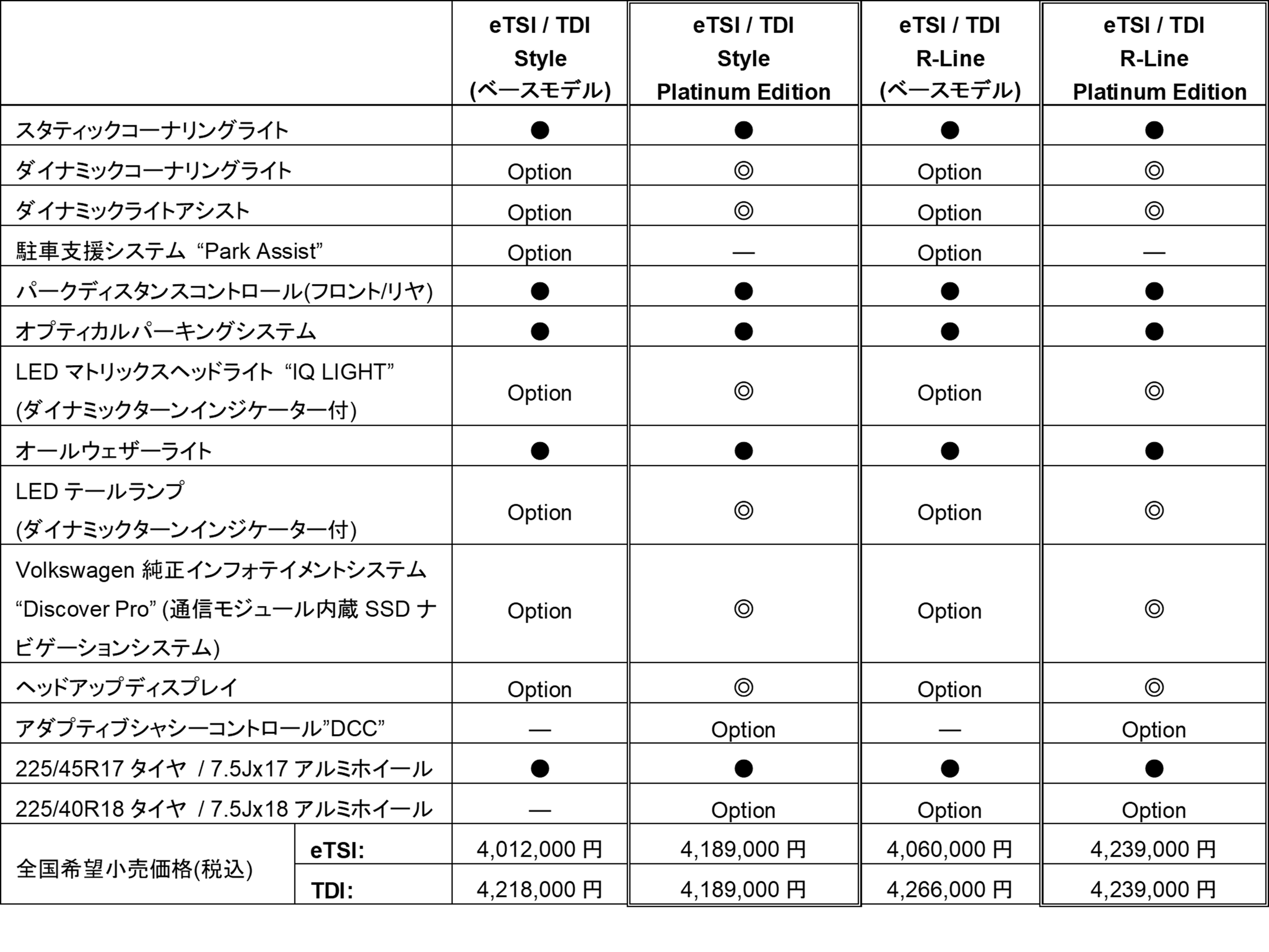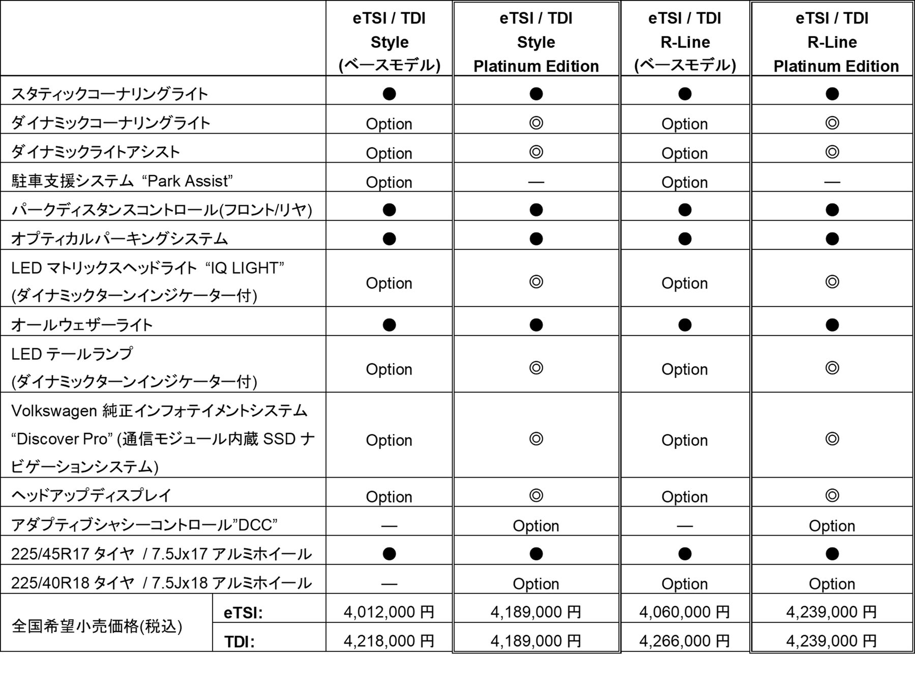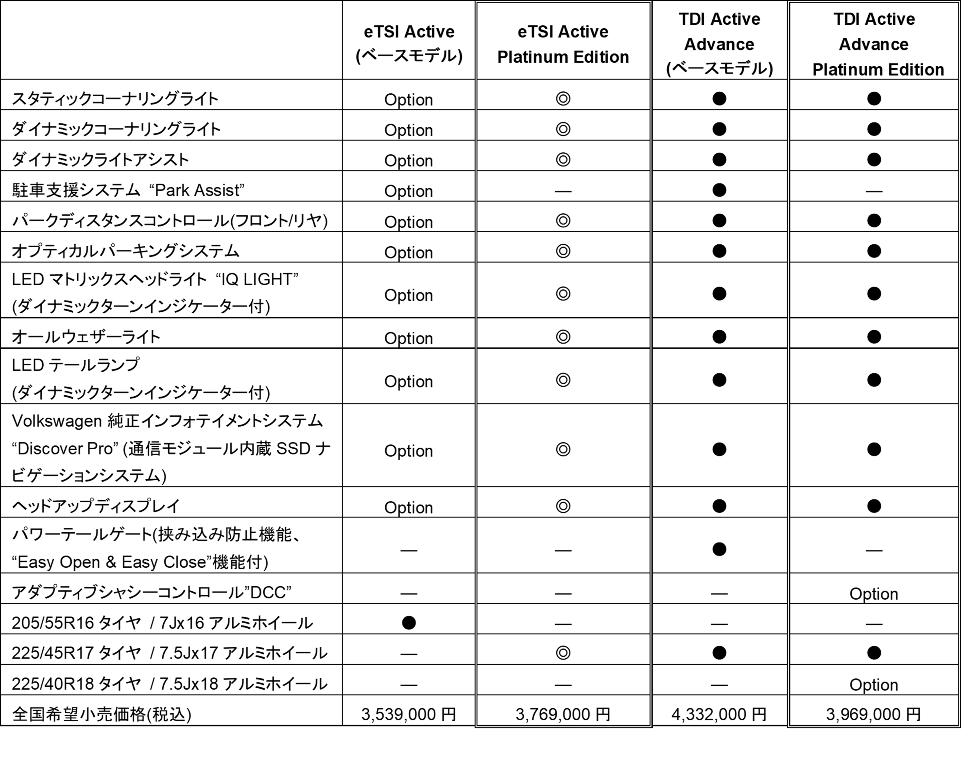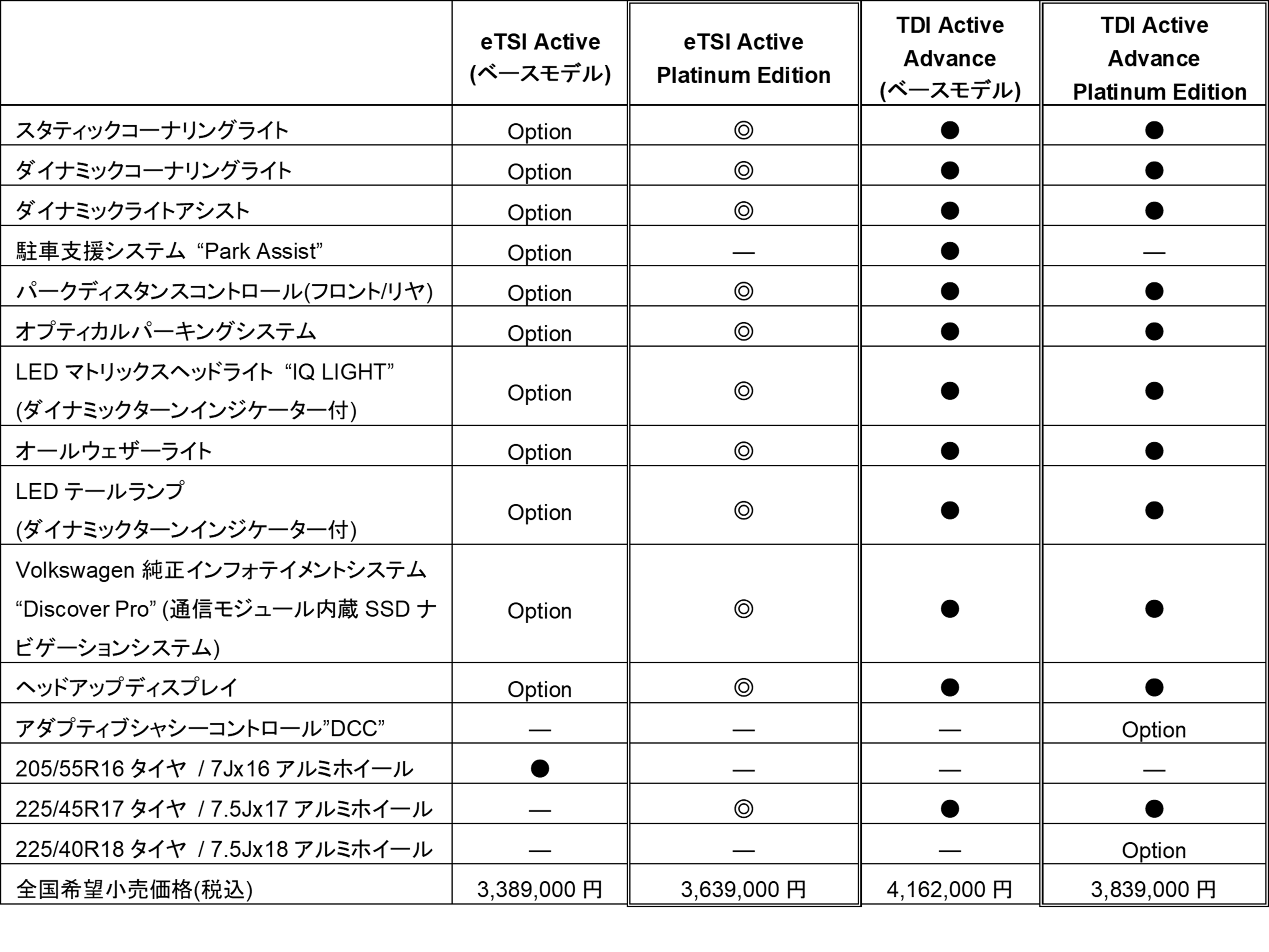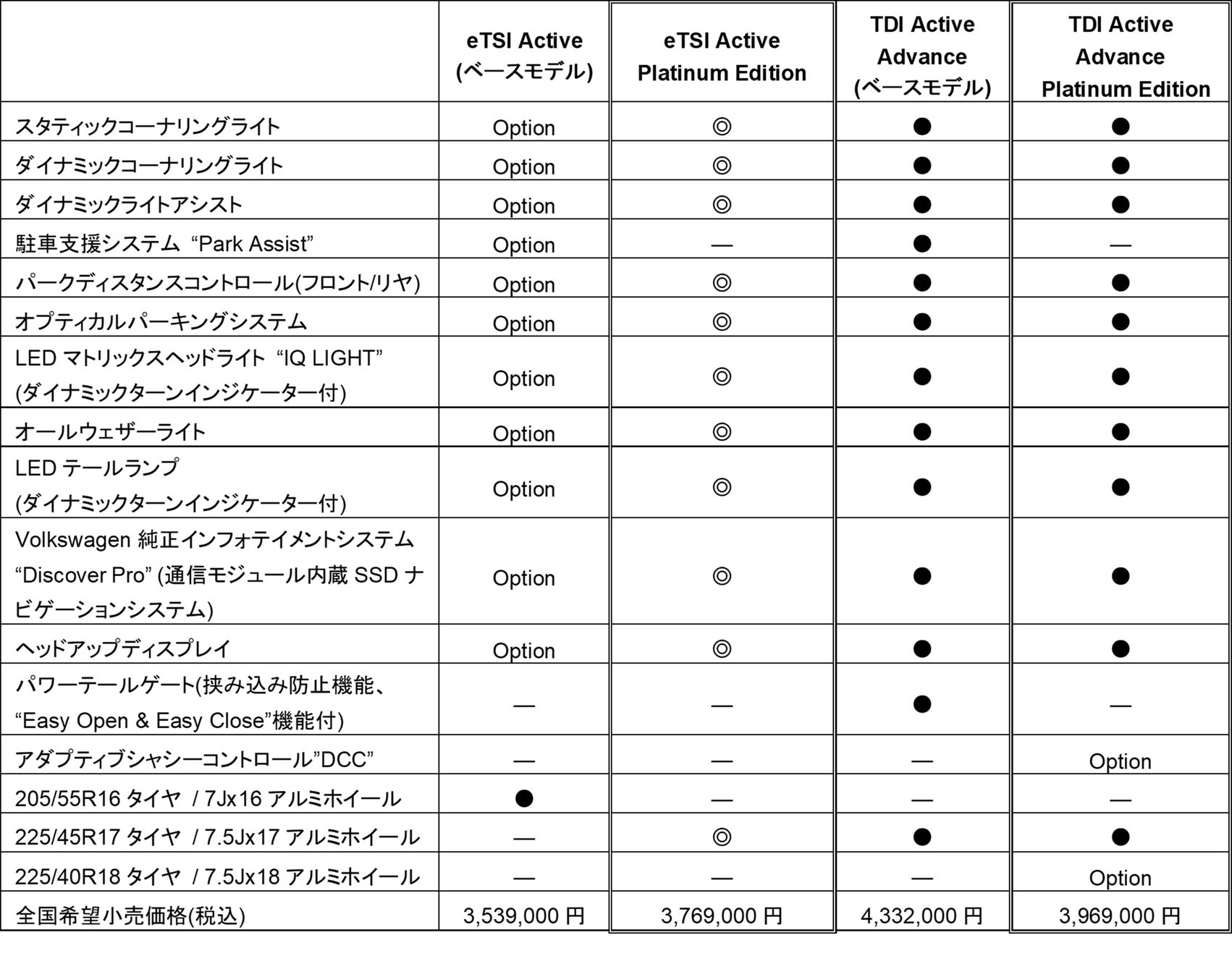 ◎:特別装備 ●:標準装備 Option:オプション ―:設定なし