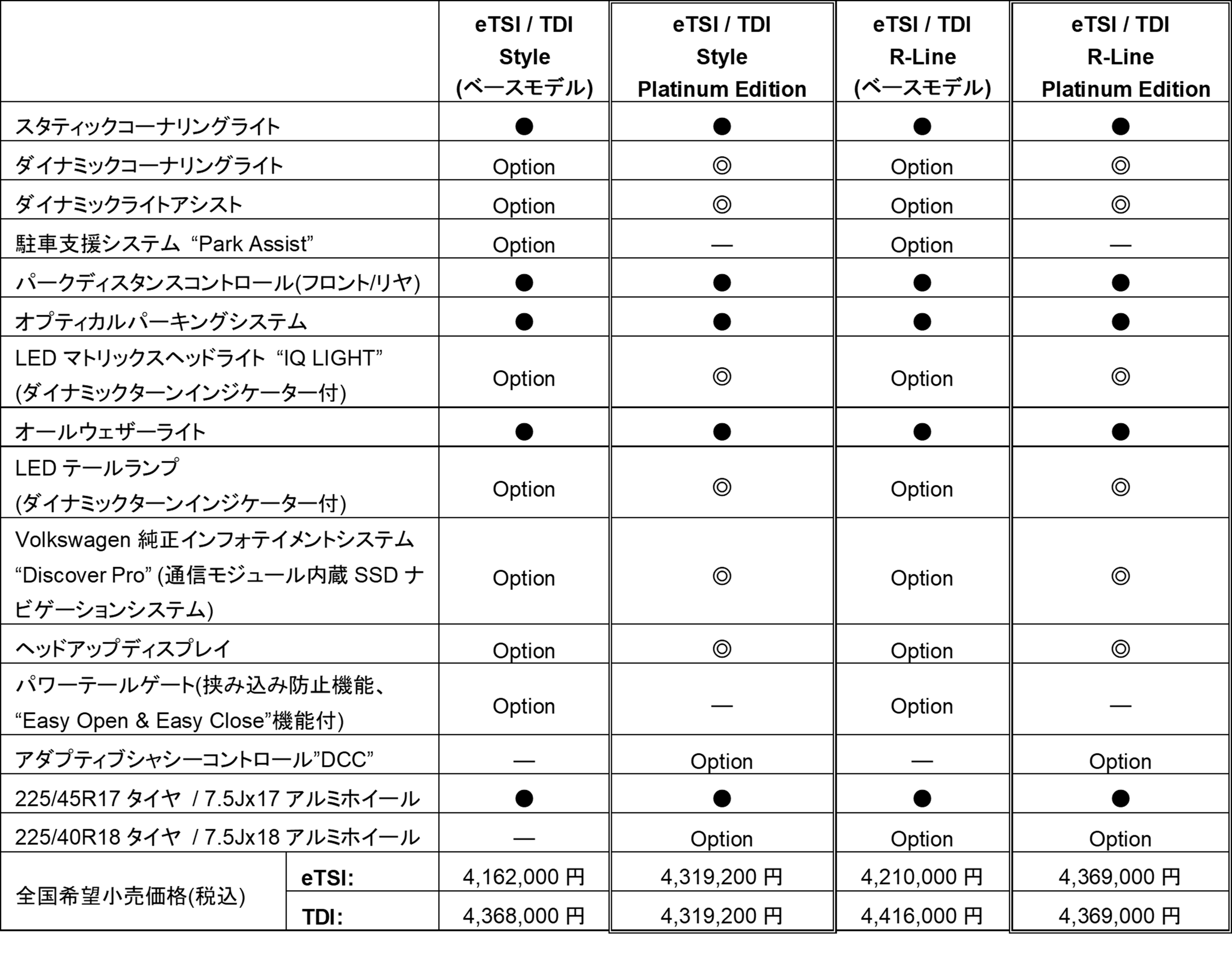 また、フォルクスワーゲン独自の「ツインドージングテクノロジー」を採用することで排出ガスに含まれる NOx を低減し、内燃機関における環境性能をさらに高めた最新世代のクリーンディーゼルエンジンを搭載する「Golf TDI Platinum Edition」「Golf Variant TDI Platinum Edition」は、その価格をガソリンエンジン搭載のグレードに匹敵するものとなるよう、さらにお買い得な設定としています。これにより、昨年導入したブランド初のフル電動 SUV「ID.4」とあわせて内燃機関搭載モデルと電気自動車という 2 本の柱で、環境性能の高いモデルをお探しのお客様の幅広いニーズにお応えしてまいります。