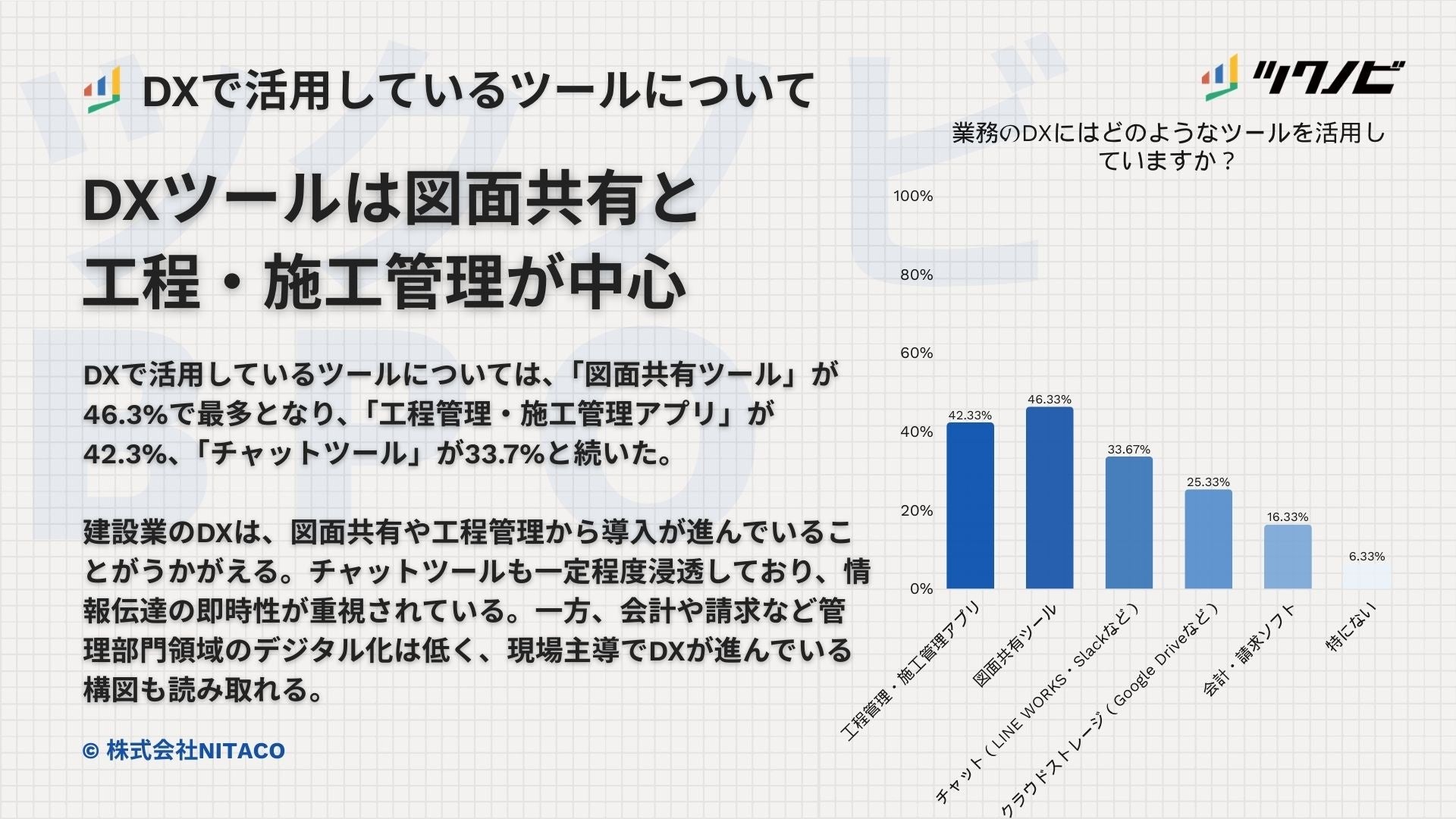 DXで活用しているツールについては、「図面共有ツール」が46.3%で最も多く、「工程管理・施工管理アプリ」が42.3%、「チャットツール」が33.7%で続きました。「クラウドストレージ」は25.3%、「会計・請求ソフト」は16.3%、「特にない」は6.3%となっています。