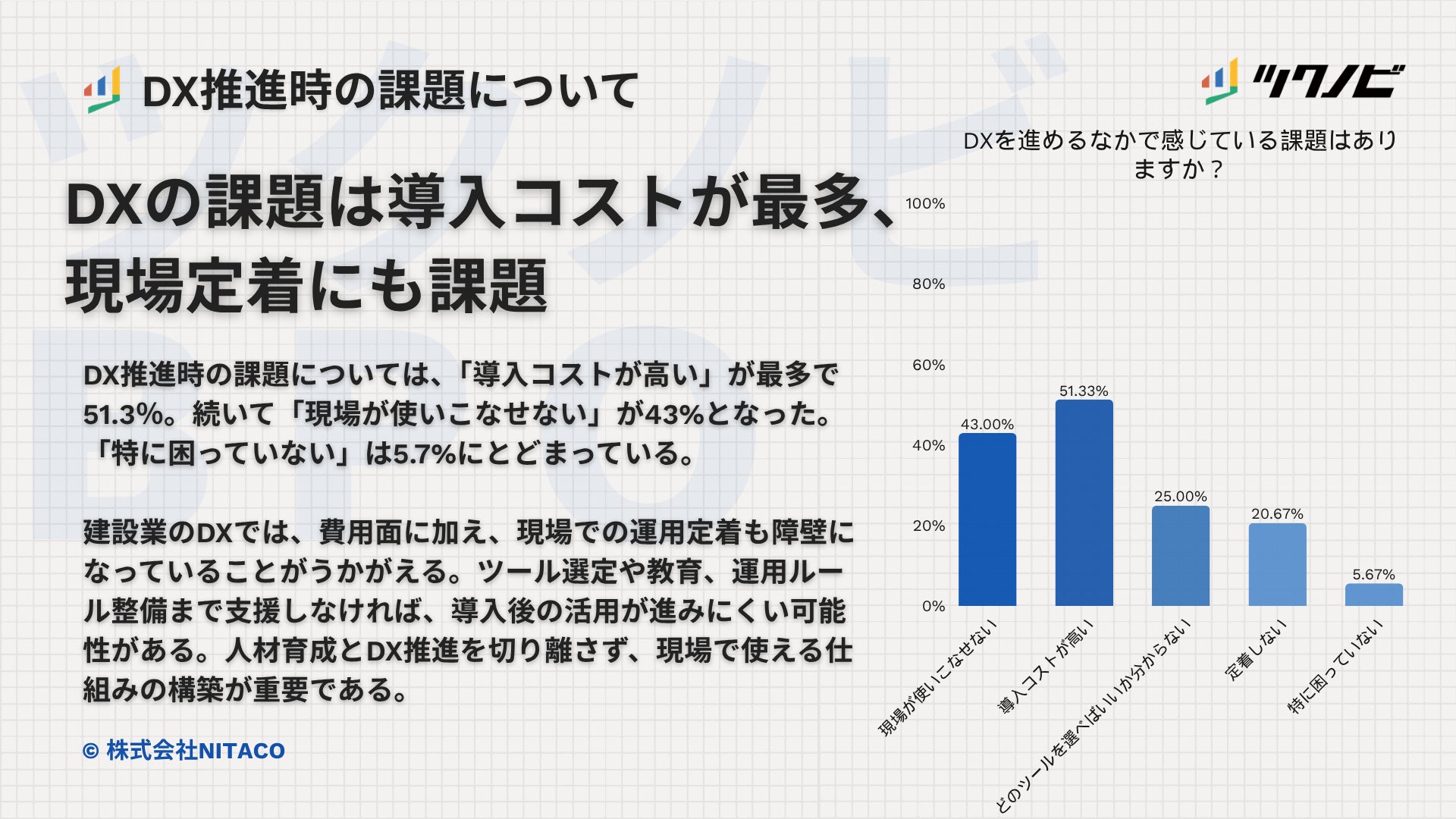 DX推進時の課題については、「導入コストが高い」が51.3%で最も多く、次いで「現場が使いこなせない」が43%となりました。「どのツールを選べばいいか分からない」は25%、「定着しない」は20.7%で、「特に困っていない」は5.7%にとどまりました。