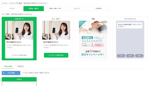 LINE公式アカウント拡張ツール「L Message(エルメッセージ)」では、メッセージ配信やステップ配信機能でテキスト・パネル・画像・動画・ボタン・スタンプ・位置情報などを送信可能です。