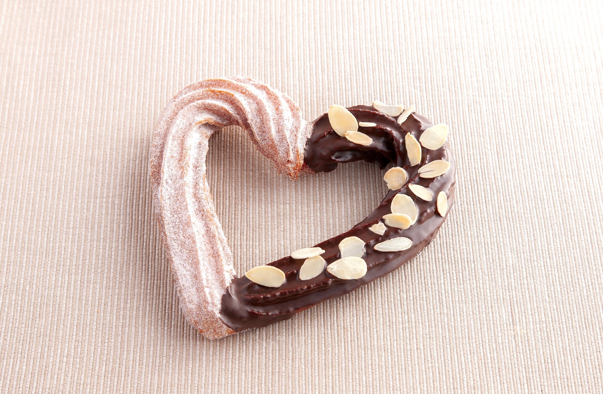 人気のチュロスがハートの形に可愛く変身♪シュガーとアーモンドスライスがのったチョコの2つの味が楽しめるお得なチュロス。