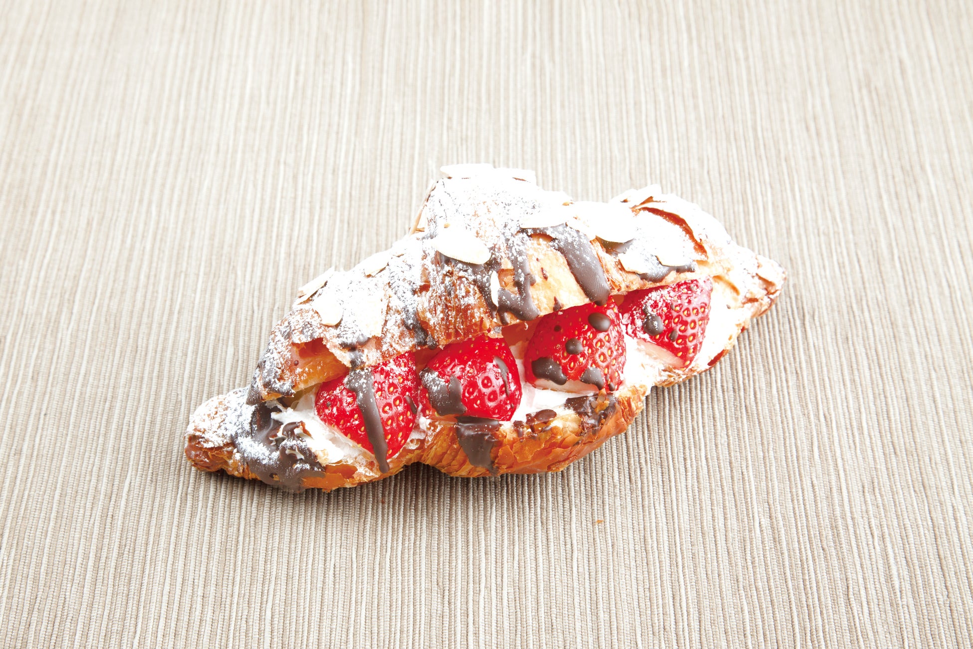サクサクのクロワッサンにカスタードクリームとホイップクリーム、いちごをサンドし、上からチョコをかけ、ローストアーモンドをトッピング!
