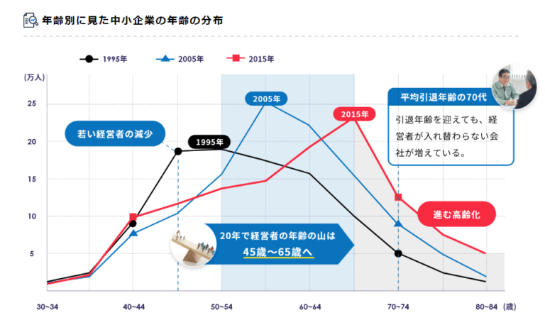 2025年までに、70歳(平均引退年齢)を超える中小企業・小規模事業者の経営者は約245万人となり、その約半数の127万(日本企業全体の1/3)が後継者未定。