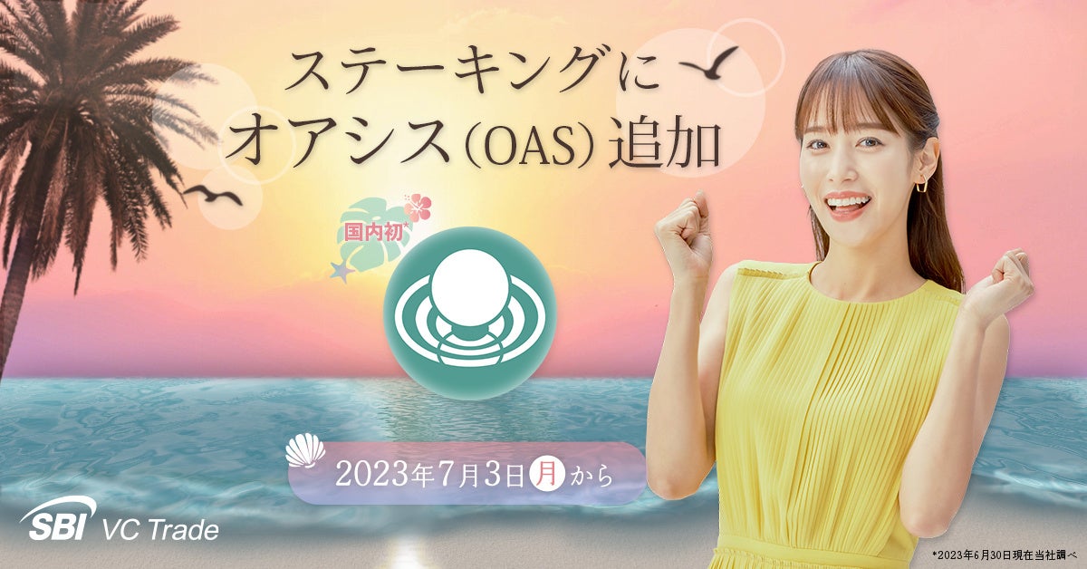 SBI VCトレード株式会社(本社:東京都港区、代表取締役社長:近藤 智彦、以下「当社」)は、2023年7月3日より、「ステーキングサービス」取扱銘柄にオアシス(OAS)を追加することをお知らせいたします。OASのステーキングサービスでの取扱いは国内初となります。(※2023年6月30日現在、当社調べ)これにより当社のステーキングサービスでの取扱銘柄は7銘柄となり、今後も順次拡大させていく予定です。