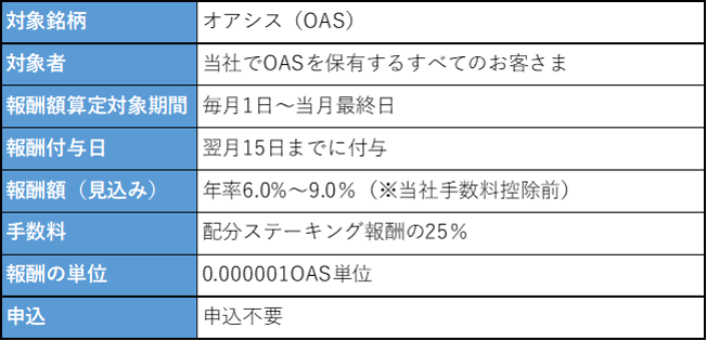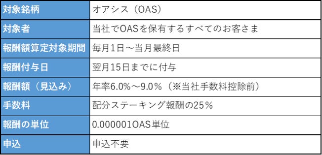 OASステーキング報酬については、当社で獲得した月次のステーキング報酬実績に応じた額をお客様に付与させていただきますが、現時点では年率6.0%~9.0%(※当社手数料控除前)程度を見込んでおります。なお入庫につきましては、当社で別途設定する一定数量より対応させていただきます(特別入庫対応)。