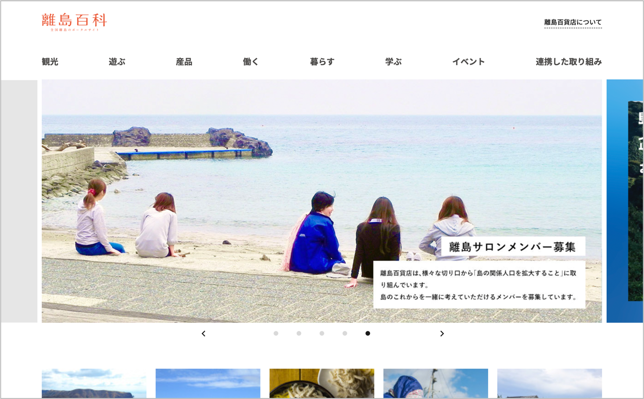 全国の島々の情報を独自にまとめた離島ポータルサイト。テーマごとに検索が可能で、旅行を検討している方、仕事や移住先を探している離島ファンなど、それぞれ興味のある入口から島の情報に巡り合えるサイトづくりを目指しています。