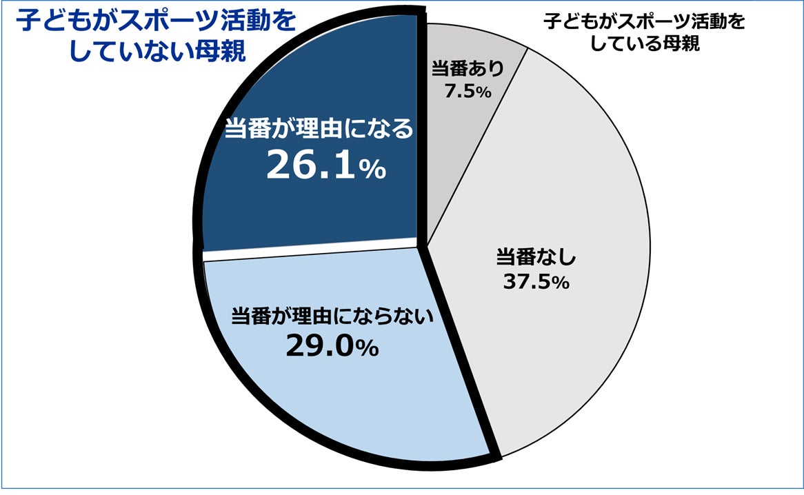 当番をめぐる実態を、「当番をしている母親」「当番はしていないが、スポーツ活動をしている母親」「当番を理由にスポーツ活動をしない母親」「その他の理由でスポーツ活動をしない母親」にわけて、全体の分布を示した。対象となる母親全体を母数にすると、現在当番を担当している母親は7.5%にすぎない。しかし、当番の負担を理由にスポーツ活動を敬遠する母親は26.1%にのぼる。