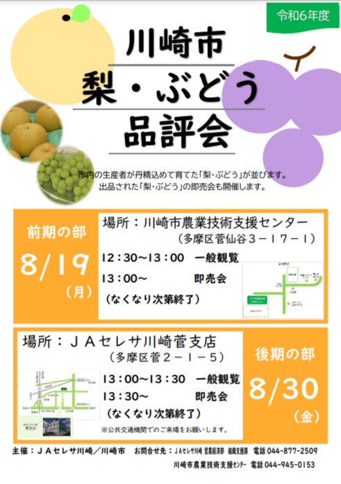 川崎市内産の梨とぶどうの栽培技術向上と消費拡大を図り、生産の安定に役立てることを目的に、当市およびJAセレサ川崎の主催で、「川崎市梨・ぶどう品評会」を毎年開催しています。