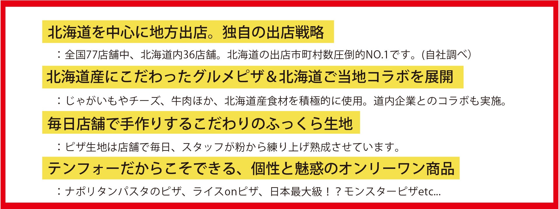 事業内容:宅配ピザチェーン「テンフォー」・宅配肉丼チェーン「第104代肉横綱」・