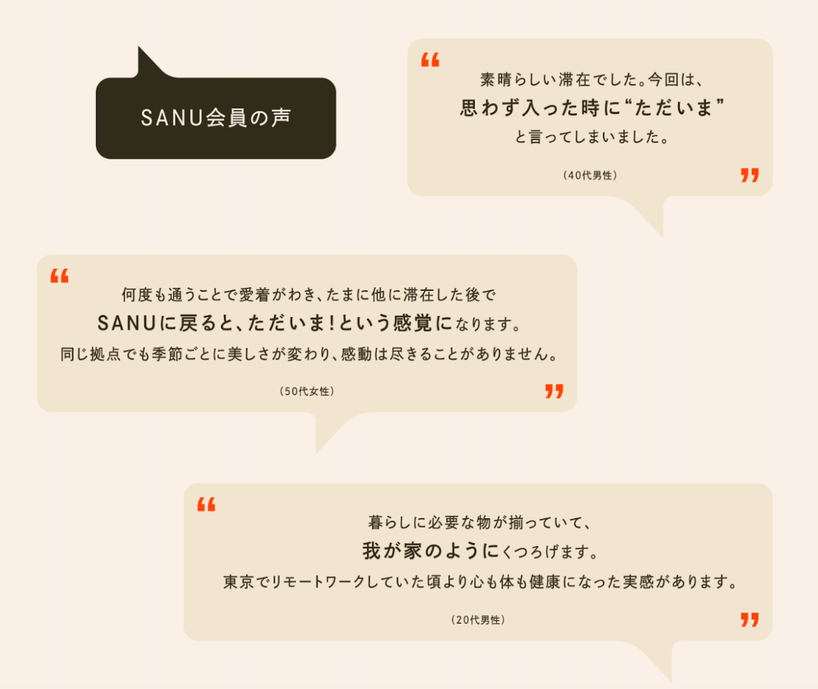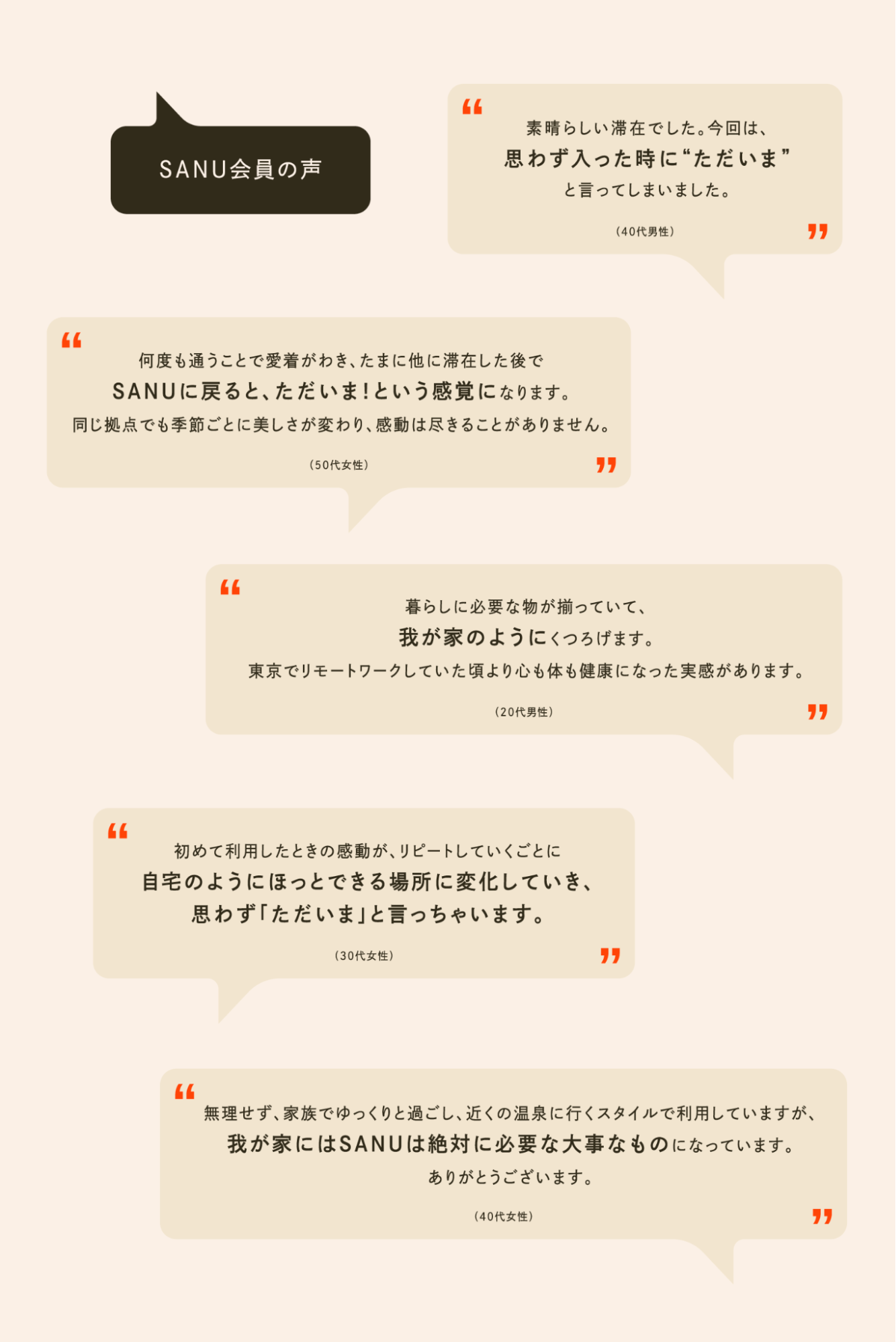 30~40代の共働き夫婦・カップルやファミリー、50~60代まで幅広く「自然の中のもう一つの家」を愛用いただいています。SANU 2nd Homeを始めるきっかけは、以下のような背景です。