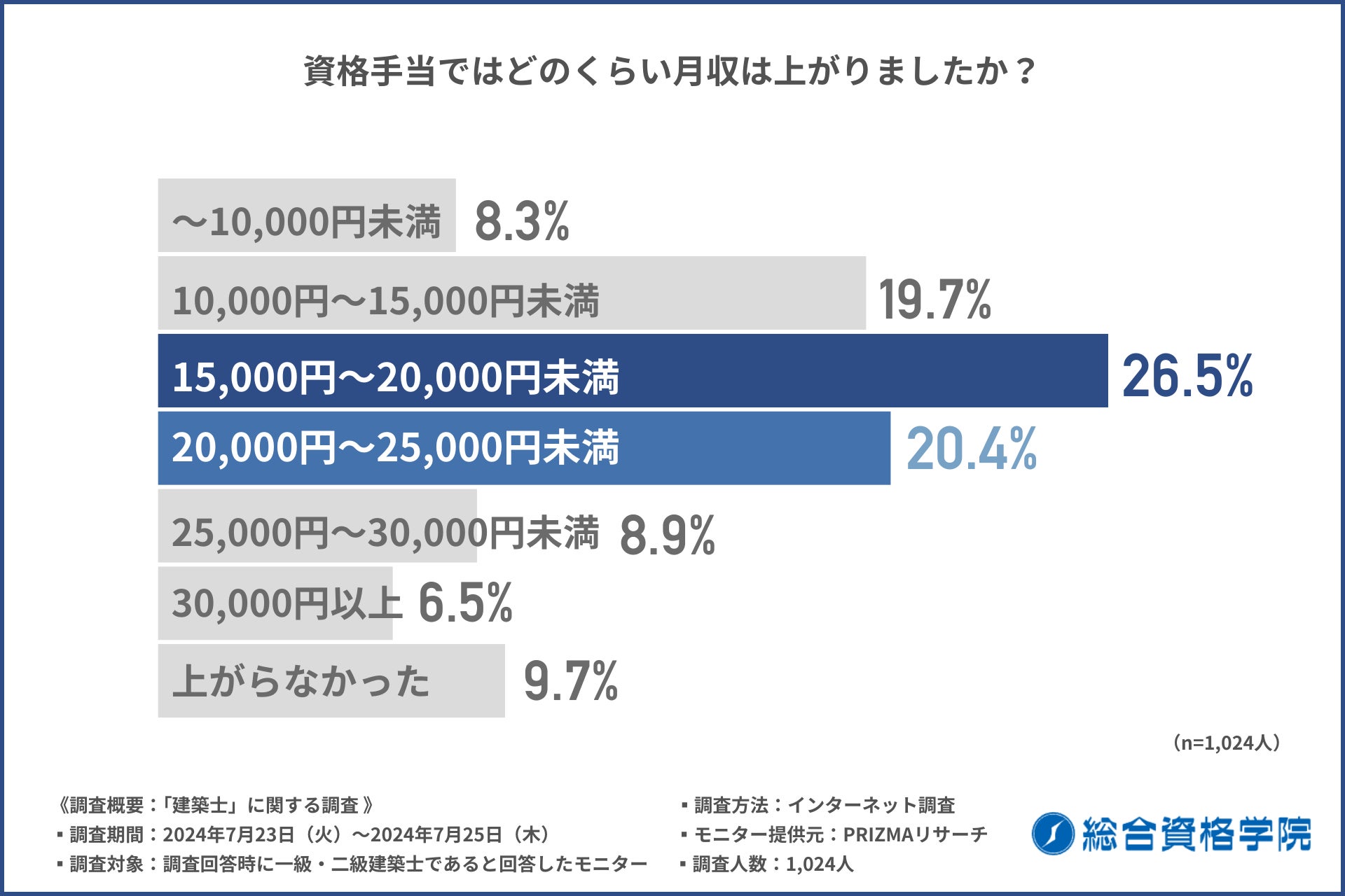 「資格手当ではどのくらい月収は上がりましたか?」と質問したところ、『15,000円~20,000円未満(26.5%)』と回答した方が最も多く、次いで『20,000円~25,000円未満(20.4%)』、『10,000円~15,000円未満(19.7%)』と続きました。