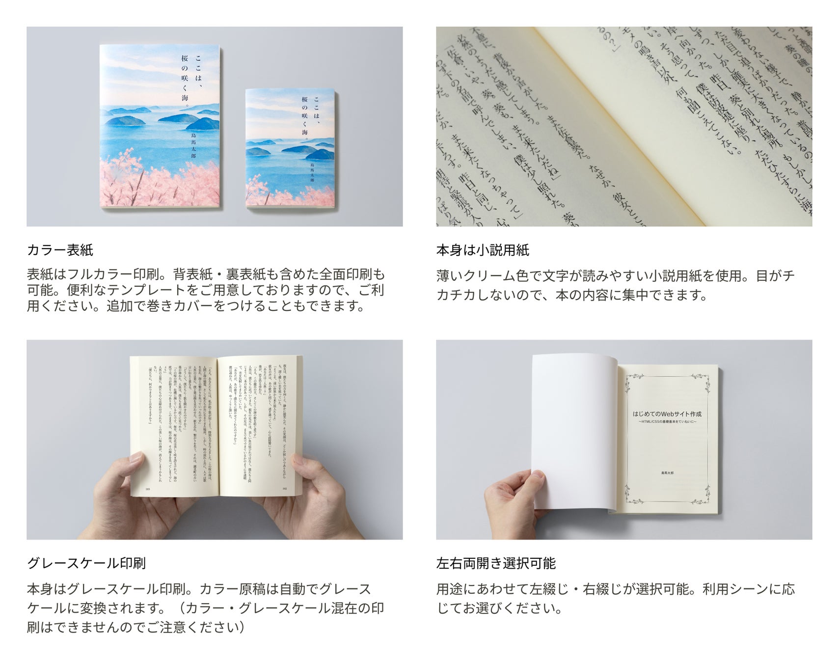 小説、文集、技術書などの用途におすすめの仕様です。専用の小説用紙を採用し、小説限定の機能として、タイトルや著者名を入力するだけで簡単に表紙を作成できる「かんたん表紙作成」機能を提供します。