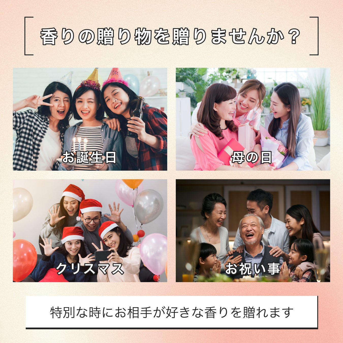 「お相手が好きな香りを選べるので気軽に贈りやすい」、「香りのラインナップが豊富でどれにするか悩むのも楽しい」などといったお声を多数いただいており、新しい香りとの出会いを楽しんでいただいております。